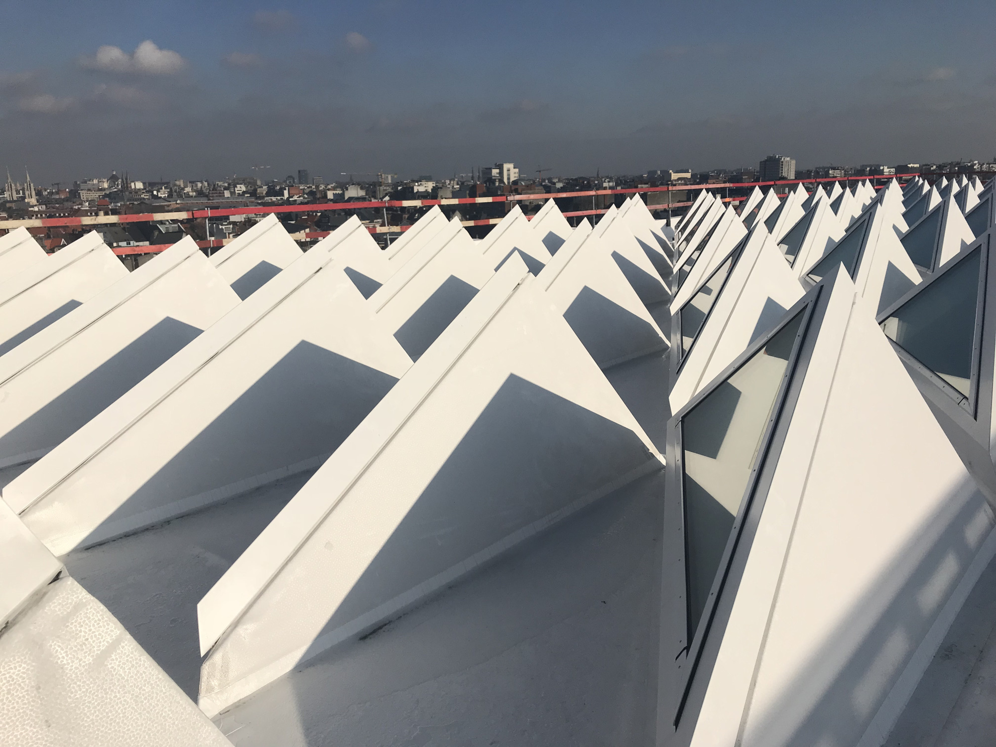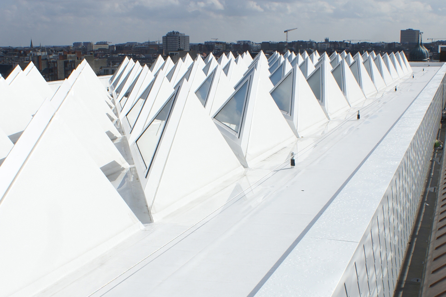 Sono stati impiegati 1.665 mq di membrana bianca Renolit Alkorbright, tagliata su misura per essere installata su 198 lucernari triangolari con dimensioni diverse tra loro che costituiscono la copertura del Museo Reale delle Belle Arti di Anversa (Kmska), in Belgio.