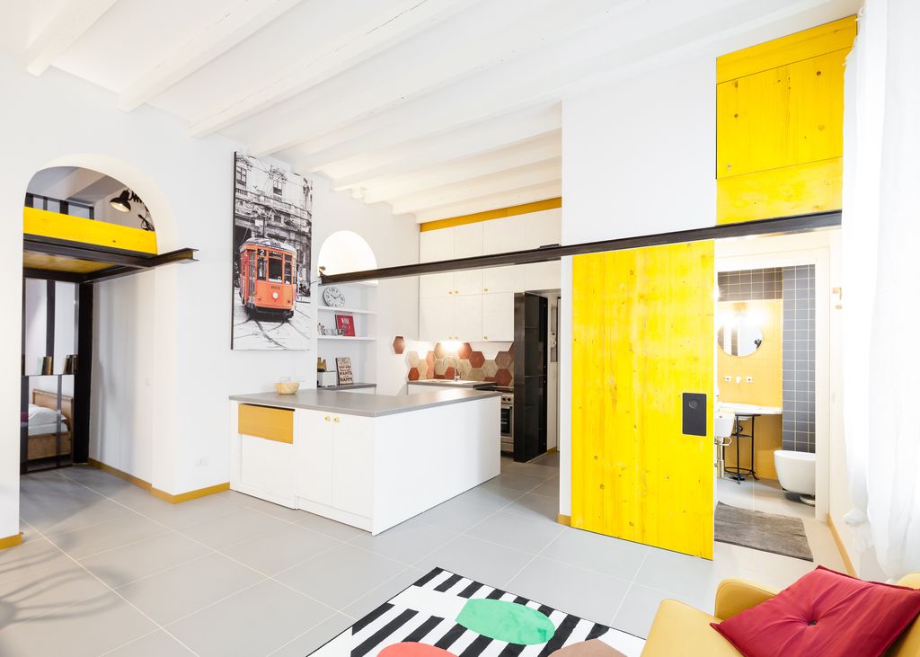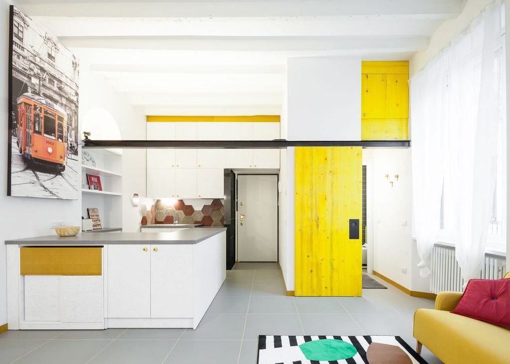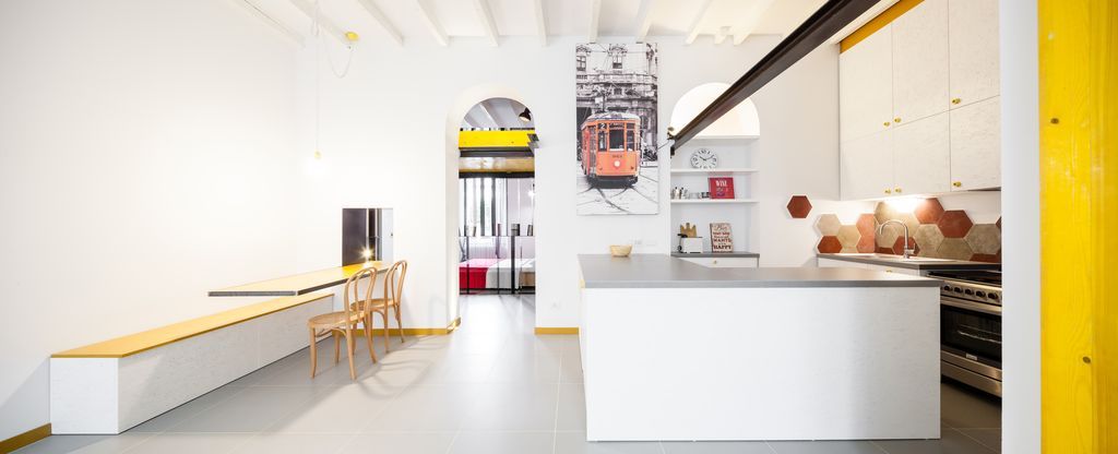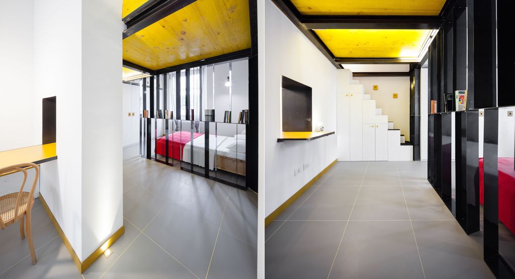 Al tema della realizzazione degli arredi su misura si affianca anche quello del riuso e dell’impiego di elementi che vengono riadattati per nuove funzioni all’interno dell’abitazione. Così le piastrelle esagonali originali trovate a pavimento ma tali per quantità da non poter essere riutilizzate per l’intera superficie, sono state recuperate, lavate, consolidate e utilizzate per la parete della cucina e diverse assi da cantiere, dipinte di giallo e impreziosite di dettagli in mdf nero, sono state impiegate per la porta scorrevole del bagno e per il soppalco.