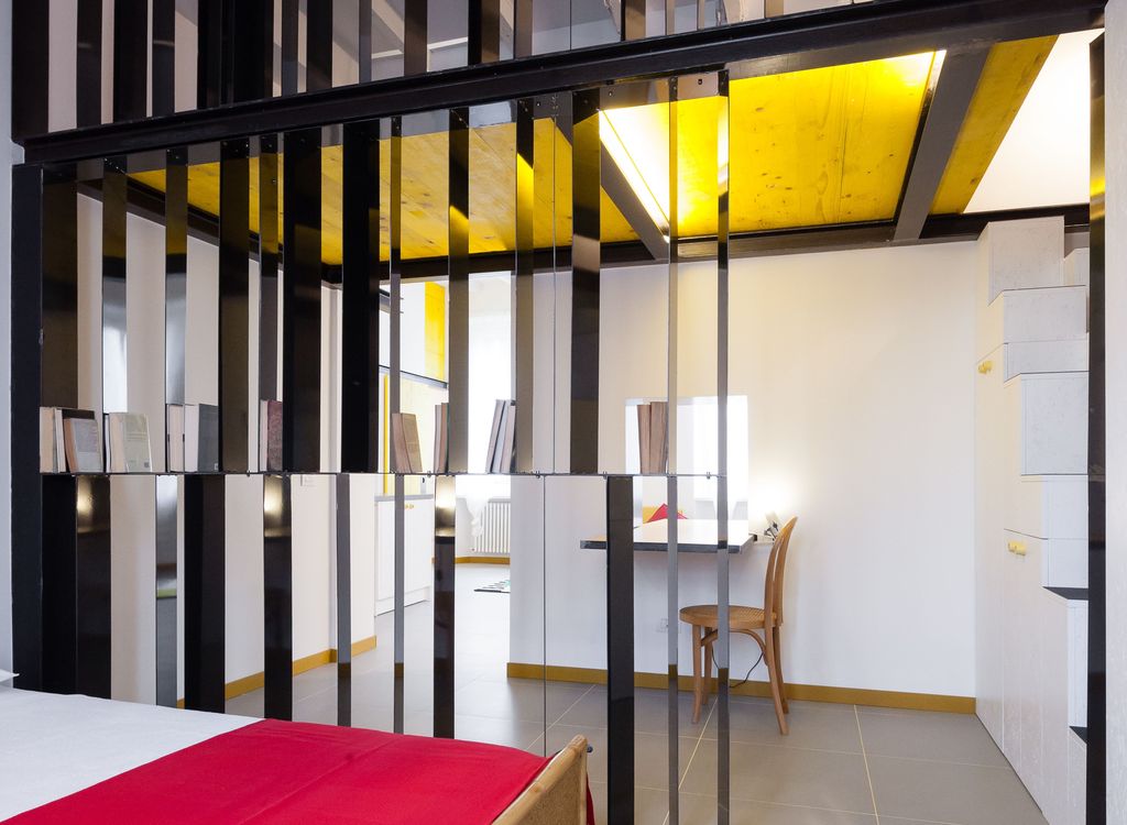L’anticamera nella zona notte può diventare una sorta di angolo office, grazie al tavolo da pranzo scorrevole che diventa una scrivania. Un piccolo soppalco può trasformarsi in una nuova camera da letto per gli ospiti e il bagno, avendo la doccia e un lavabo nell’antibagno, può essere utilizzato contemporaneamente da più persone. Per quanto riguarda gli arredi, si è dato largo spazio alla trasformabilità, con il grande tavolo in ferro del soggiorno che scorre orizzontalmente ed è utilizzabile in due zone della casa, la cucina che ha un elemento mobile che può diventare una panca usata come sgabello per la colazione ma anche come piccolo mobile bar spostabile e un mobile con contenitori che è anche una scala che conduce al soppalco nella zona notte.