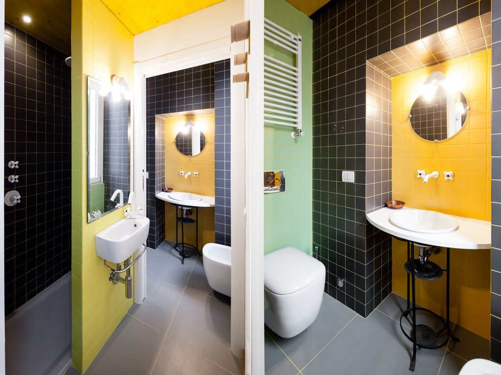 Un mix di idee e soluzioni che hanno portato alla realizzazione di un progetto coerente dal punto di vista compositivo e materico, contraddistinto da un comune denominatore, l’uso del colore giallo: riproposto in ogni ambiente, è rintracciabile in alcuni particolari degli arredi, nelle tavole da cantiere recuperate e riutilizzate diversamente e nel rivestimento di alcune pareti del bagno.
