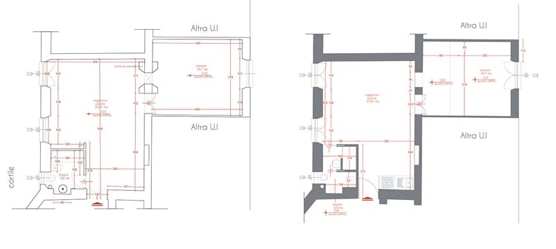 Dal punto di vista distributivo, lo spazio interno è rimasto pressoché identico, fatta eccezione per il bagno che originariamente aveva l’entrata sull’ingresso dell’abitazione. Nel progetto è stato previsto un ingresso sul lato adiacente e la realizzazione di un piccolo antibagno con una doccia annessa. Nella zona notte, grazie ad una struttura in ferro è stato predisposto un soppalco che se necessario può ospitare una seconda camera da letto.