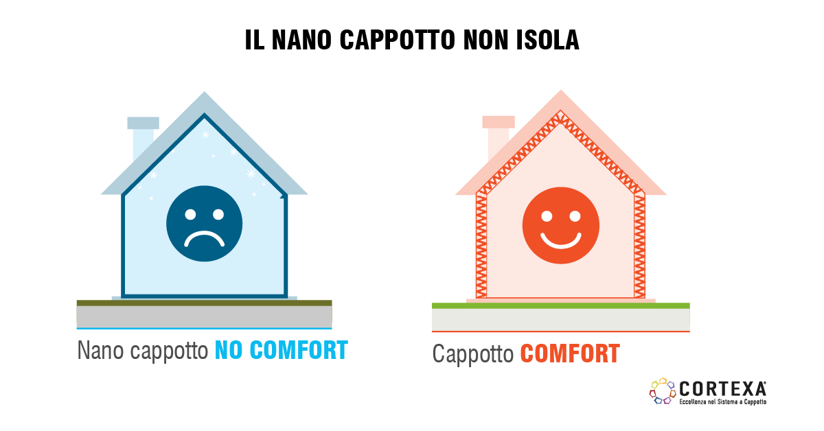 Nanocappotto, cappotto nanotecnologico, microcappotto, cappotto sottile, rasanti e pitture isolanti, rivestimenti termoriflettenti e materiali isolanti nanotecnologici: è possibile isolare in pochi mm e sostituire il cappotto termico? La risposta di Cortexa è no in quanto l’isolamento termico realizzato con materiale di pochi mm, oltre a non garantire risparmio energetico e comfort interno, non porta neppure alle trasmittanze necessarie per l’accesso alle detrazioni fiscali e al rispetto della legge