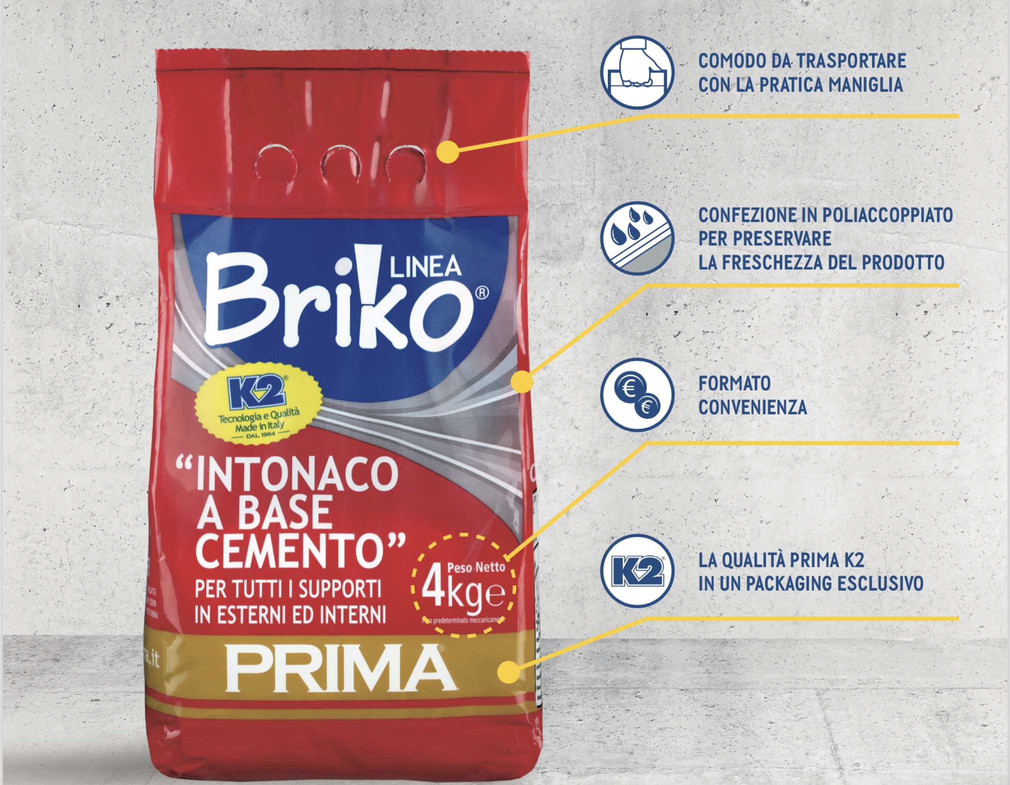 La linea Briko, prodotto dall’azienda Prima, formata dai nuovi sacchi hi-tech da 4 kg pratici e maneggevoli, comodi da trasportare grazie alla pratica maniglia, in doppio strato CPA-HTM 140 micron per preservare la freschezza del prodotto, e dalle confezioni da 1 kg, è dedicata all’edilizia leggera ed al fai da te.