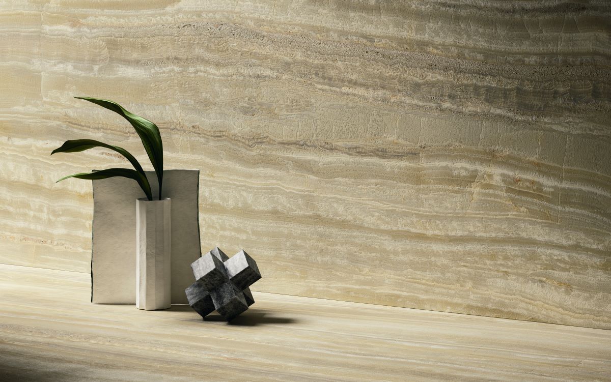 La collezione si compone di quattro superfici effetto marmo – Breccia Capraia, Onice Verde, Invisible Grey, Van Gogh White – e 3 fondi decorati.