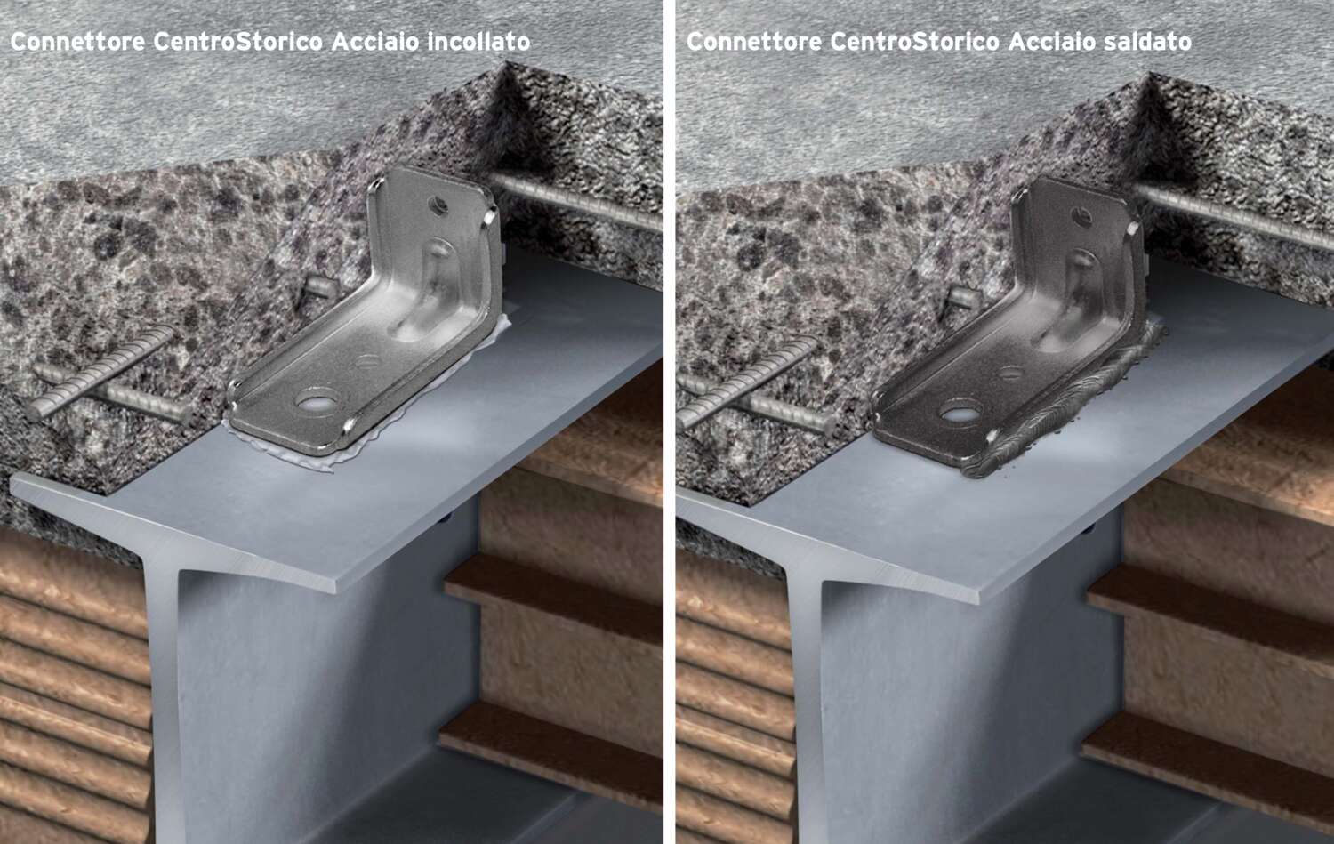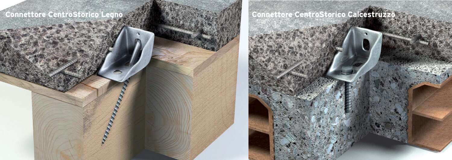 I Connettori CentroStorico sono certificati dall’Università di Trieste e Bergamo per l’interconnessione meccanica e dal Politecnico di Milano per l’interconnessione chimica in relazione alla tipologia del solaio e alla praticità di messa in opera. Il ventaglio dei Connettori della gamma si amplia ora con nuove tipologie studiate per intervenire con efficacia in un numero ancora più ampio di situazioni, sia sui tradizionali solai in legno che su quelli in acciaio, latero-cemento e calcestruzzo.