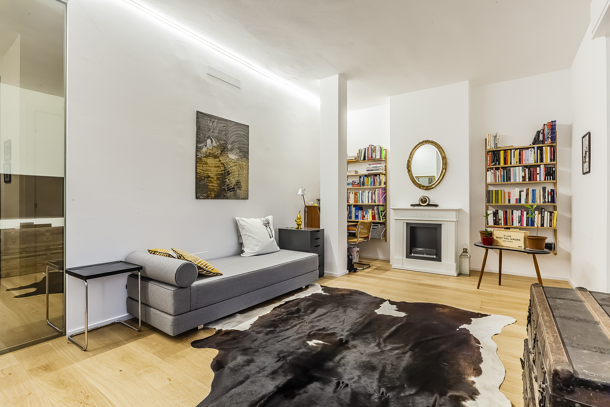 Cuore del progetto è la zona giorno, in cui convivono la cucina, l’area living e un angolo studio.
