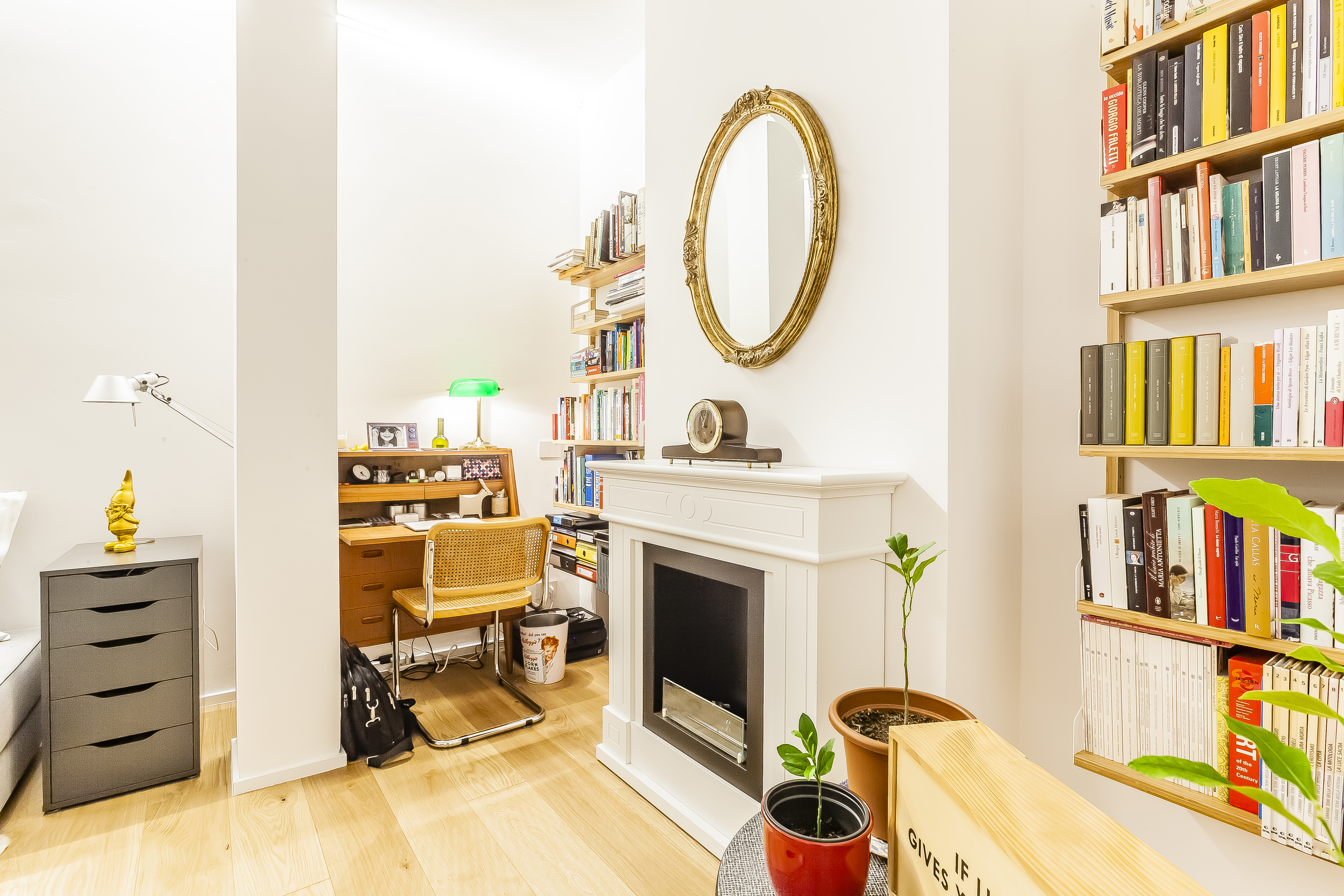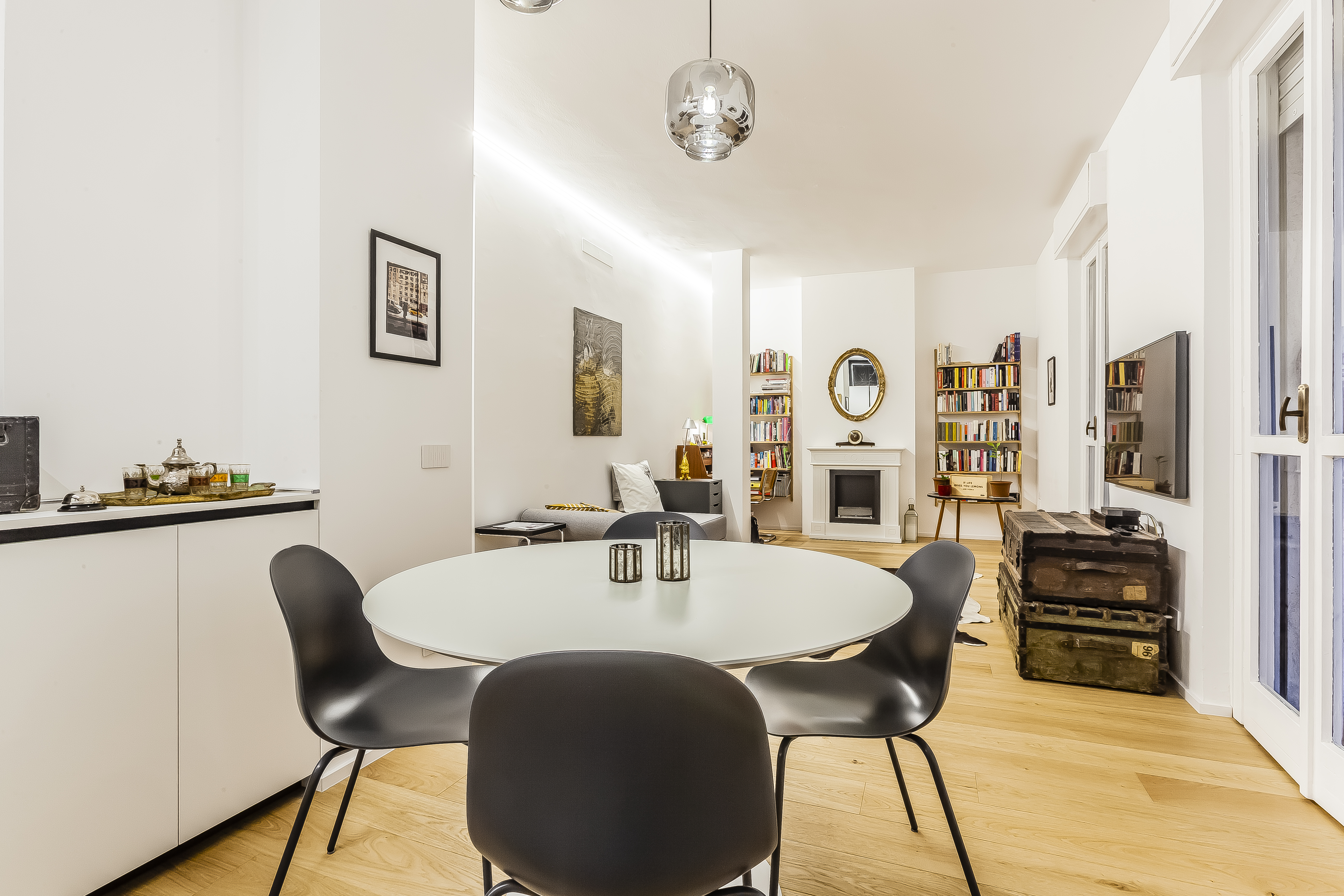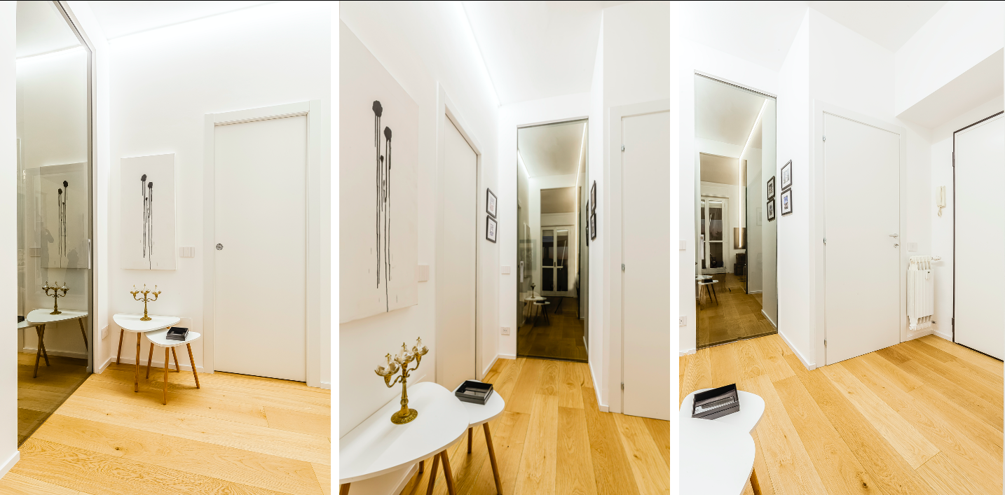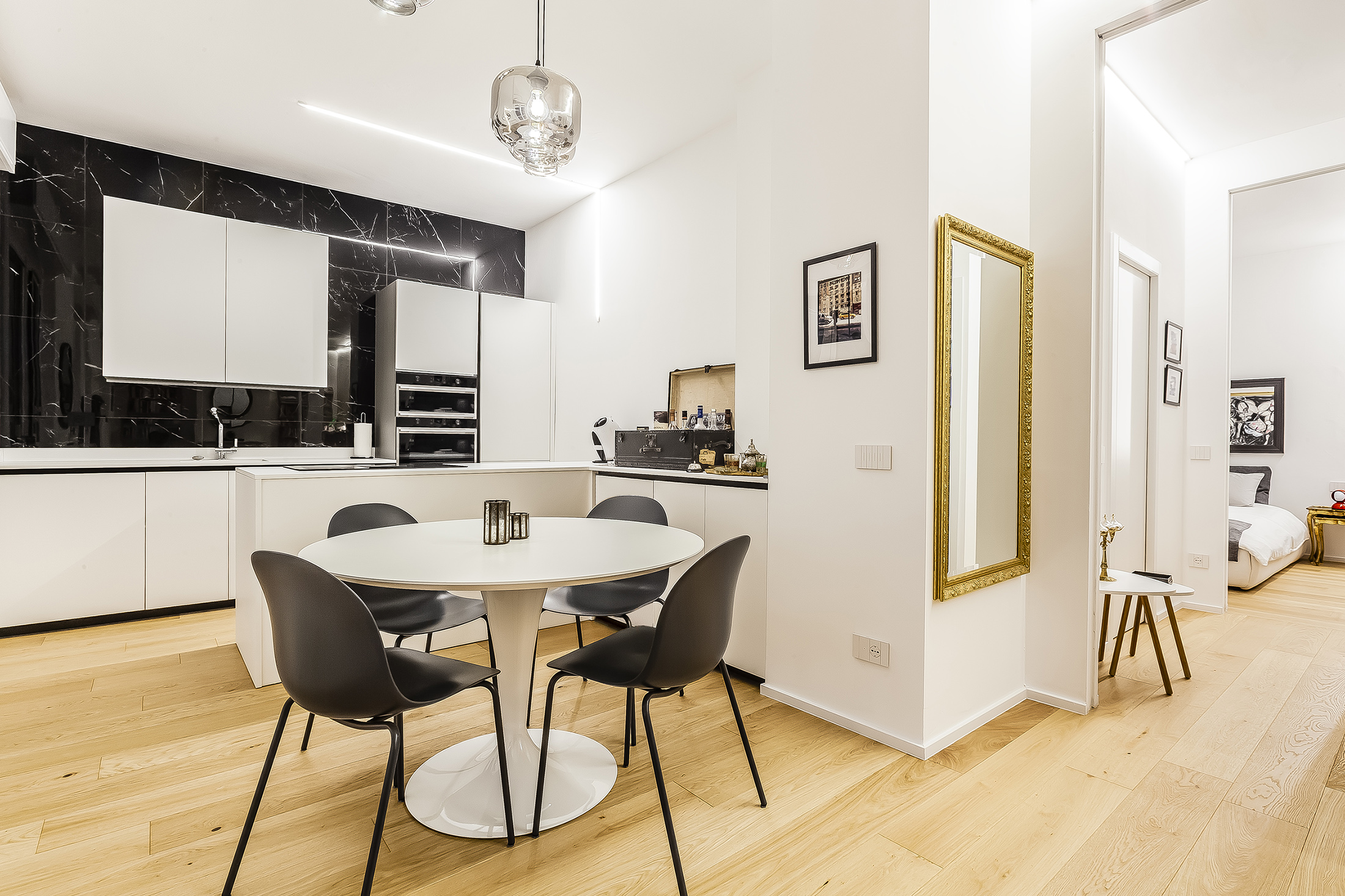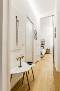 Il risultato è un’abitazione in cui regna una contaminazione controllata di stili, materiali e texture. Nella zona giorno, ad esempio, le cornici dorate degli specchi, lo scrittoio anni Sessanta e due vecchi bauli trasformati in mobile porta Tv convivono con le linee minimal di tavolo e sedie, con le superfici effetto specchio delle porte a tutt’altezza e con le tonalità particolarmente intense dei rivestimenti a muro extra lucidi. A fare da trait d’union il parquet Rovere Limo, della collezione Ground, di Woodco che, con la sua texture particolarmente materica, riveste, a meno del bagno, l’intero pavimento dell’abitazione.