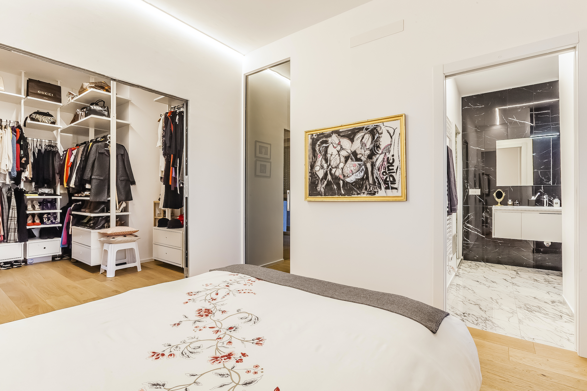 La zona notte, a cui si accede attraverso il piccolo ingresso con disimpegno e servizi per gli ospiti, è composta invece da una camera da letto padronale con annessi cabina armadio e ampio bagno dotato sia di doccia che di vasca.