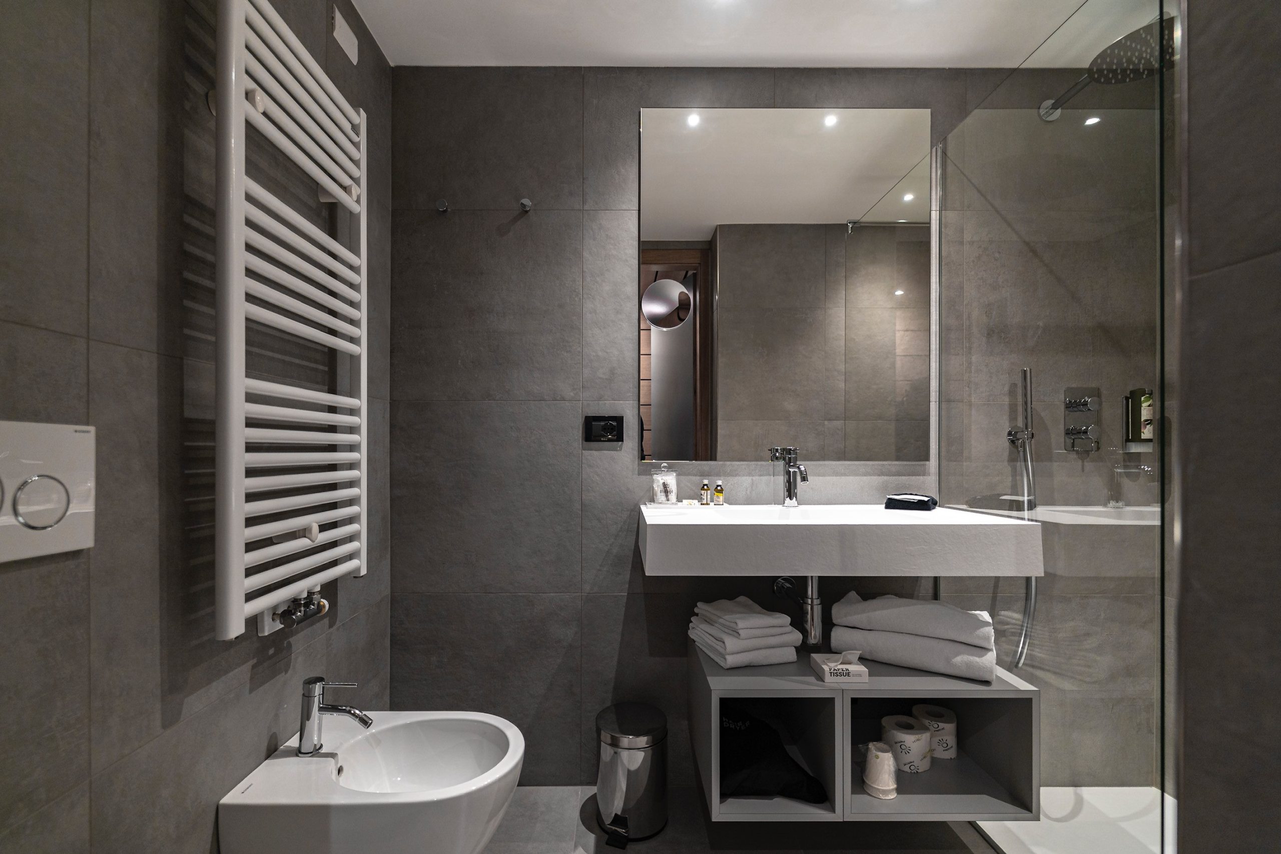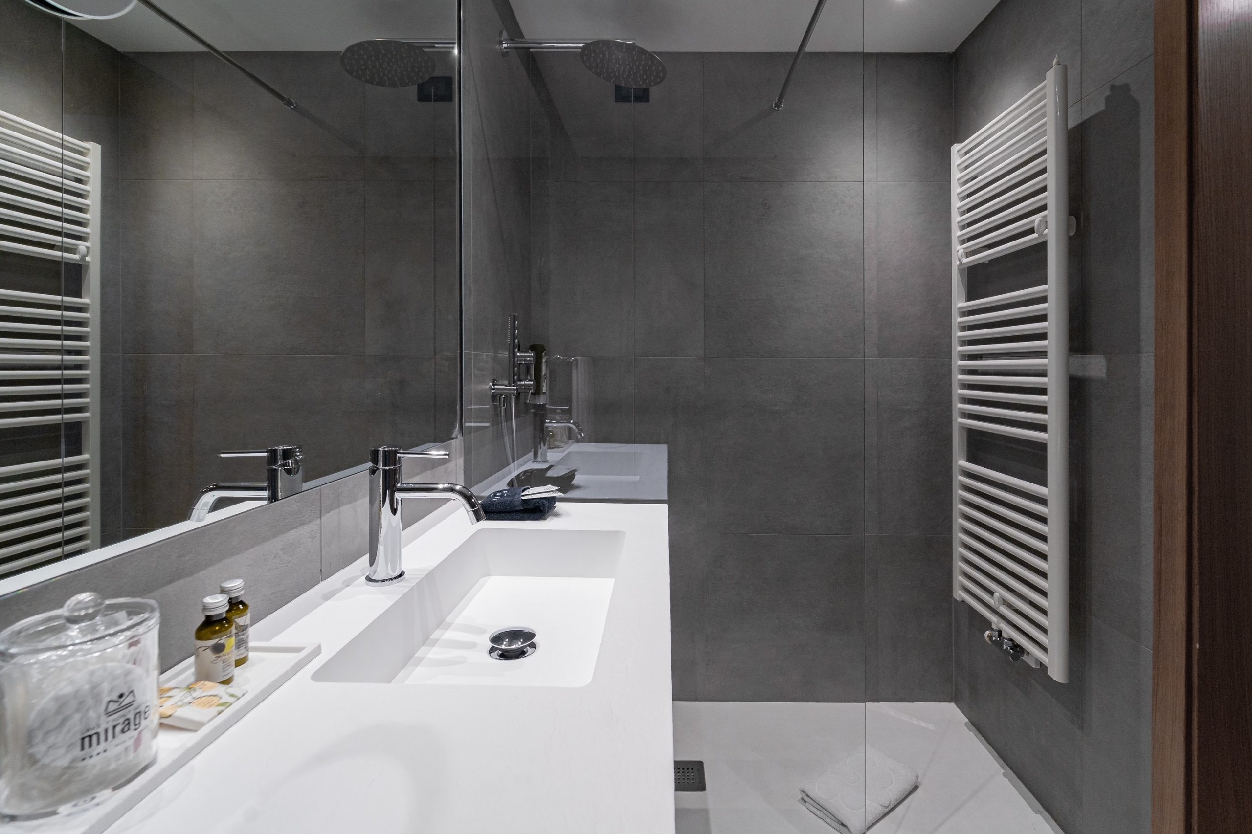 I bagni sono realizzati con l’innovativo materiale Akron che dà forma agli arredi Acquabella all’interno delle stanze da bagno.