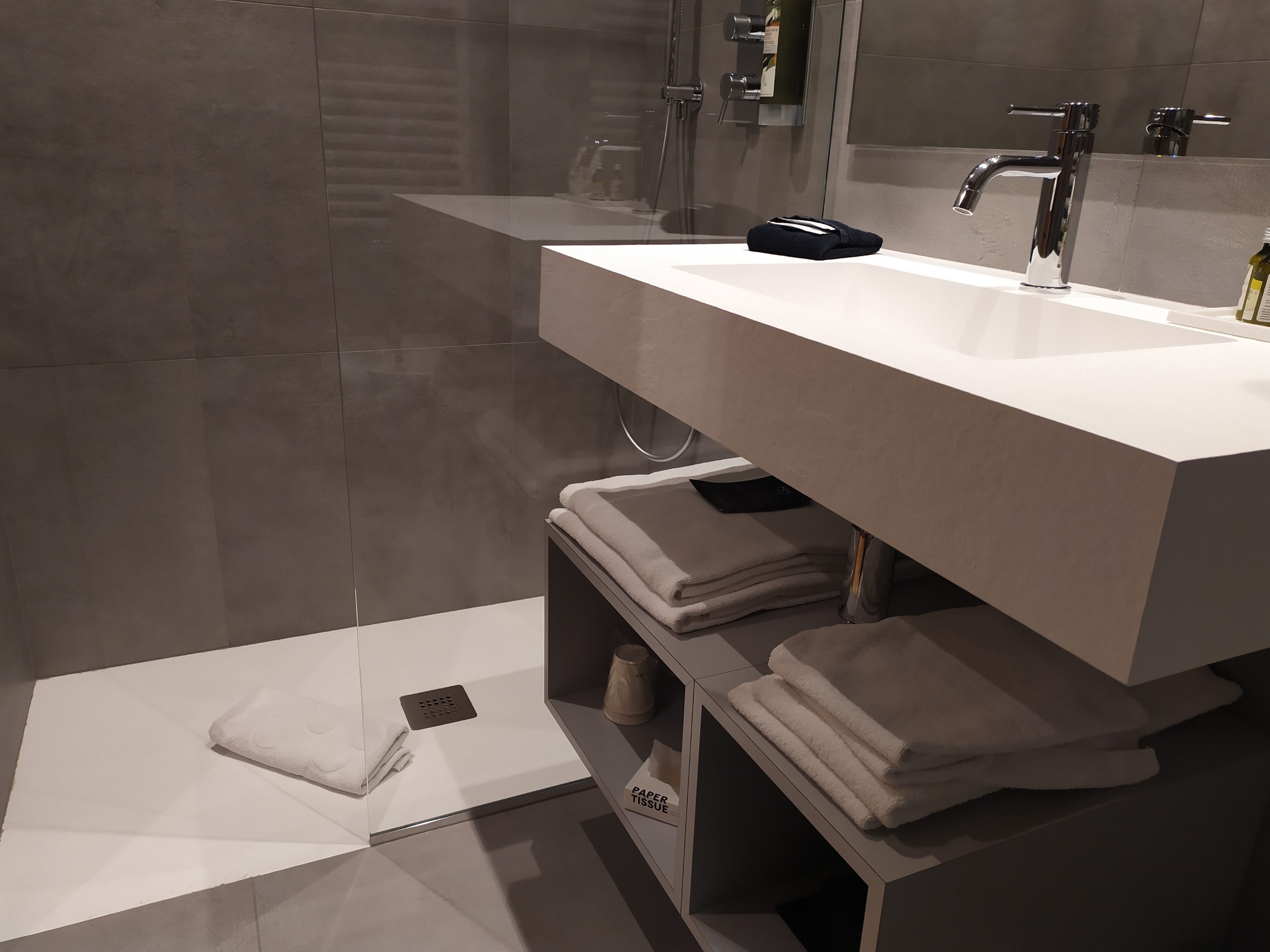 Per creare, infatti, un netto contrasto con la palette di grigi che domina l’ambiente bagno, è stata scelta la brillante tonalità bianco. Il piatto doccia Base Slate si distingue per la texture effetto ardesia sulla superficie e per la griglia di drenaggio squadrata in cui confluisce dolcemente il flusso d’acqua.