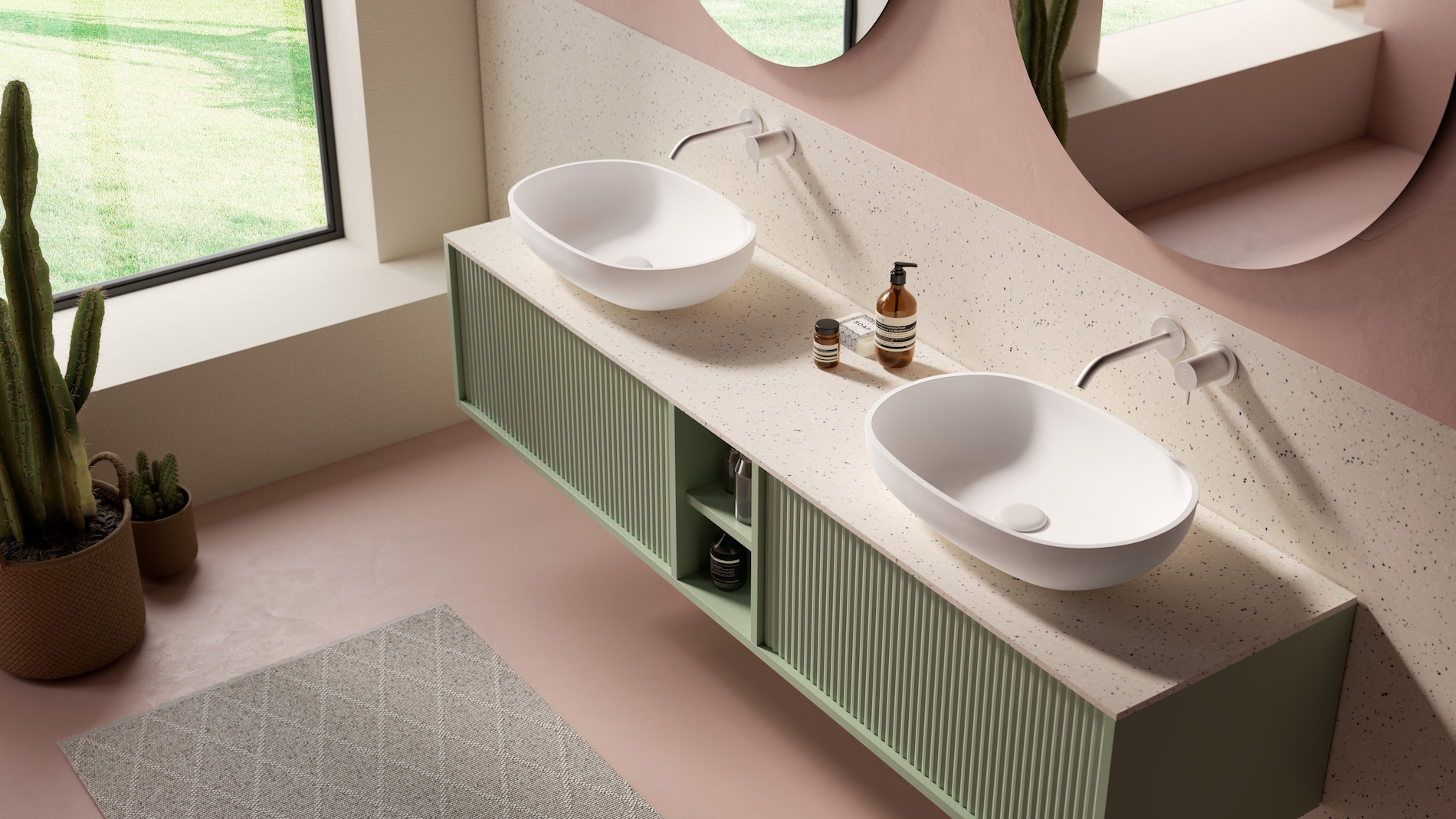 La nuova collezione di lavabi in Himacs si arricchisce di nove nuovi modelli dal design contemporaneo. Alla gamma esistente di lavabi quadrati, rettangolari e rotondi si aggiungono due nuovi lavabi da appoggio dal design ovale, progettati per essere posizionati sul piano di mobili bagno o superfici su misura.