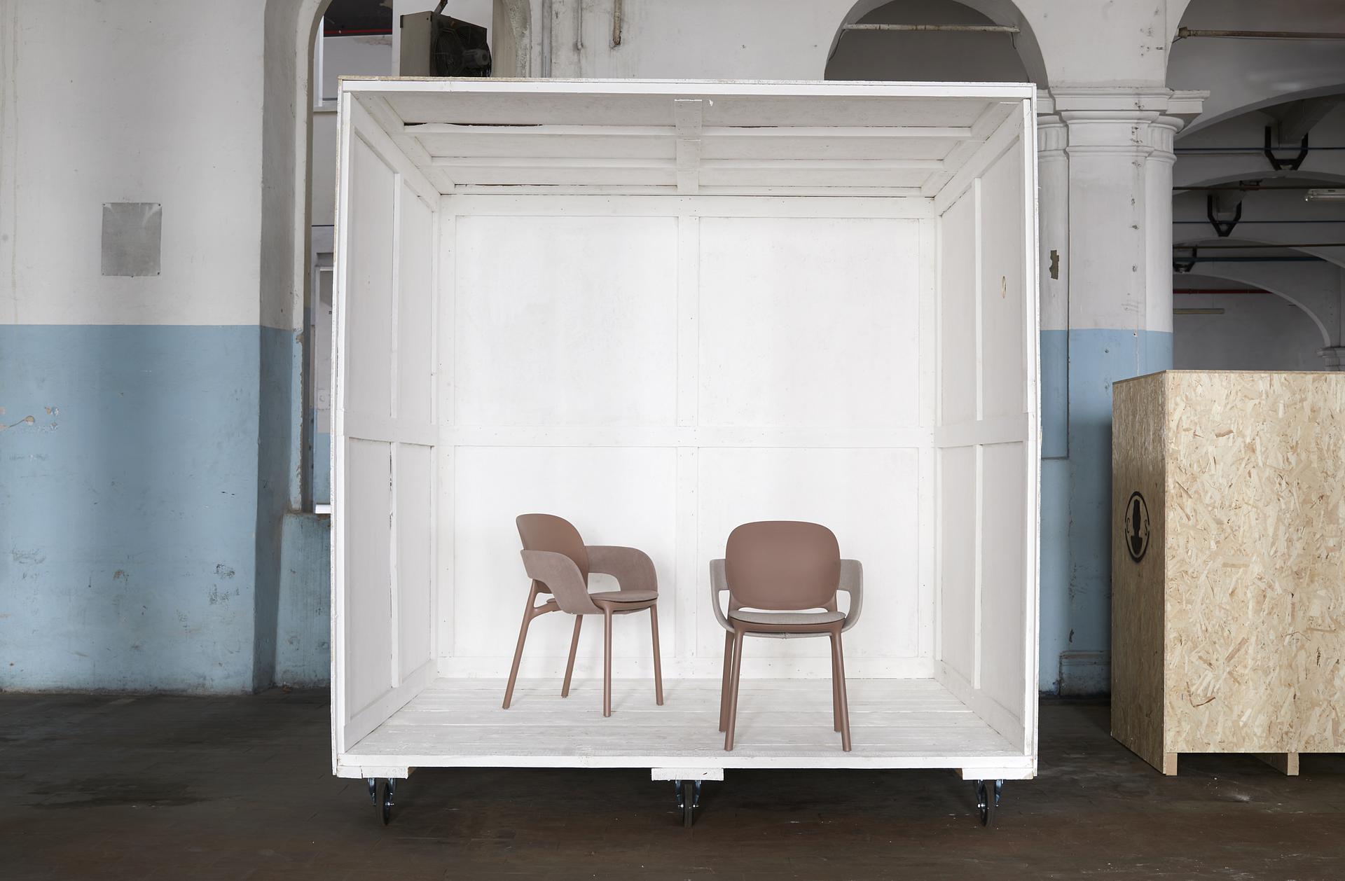 Hug (design Studio Meneghello Paolelli) è la sedia realizzata con materiali al secondo ciclo di vita. Per Hug è stato pensato un elemento estremamente caratterizzante: tra seduta e schienale, dalle forme arrotondate ed in equilibrio per la migliore fruibilità, i designer hanno introdotto un elemento a fascia, avvolgente come un abbraccio