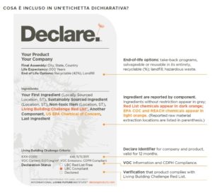 Le etichette Declare soddisfano requisiti come quelli della Red List di Living Building Challenge, la lista Svhc del Regolamento Reach e la Sin List delle sostanze presenti nel prodotto finale.
