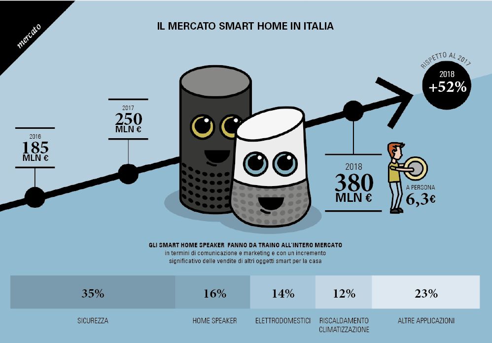 L’arrivo in Italia dei grandi Over The Top (Ott) con gli smart home speaker Google Home e Amazon Echo rivoluziona il mercato della casa connessa, che raggiunge un valore di 380 milioni di euro nel 2018, in crescita del 52% rispetto al 2017, portando investimenti in termini di comunicazione e marketing senza precedenti in ambito smart home e spingendo le vendite degli altri oggetti connessi, soprattutto legati al riscaldamento e all’illuminazione.