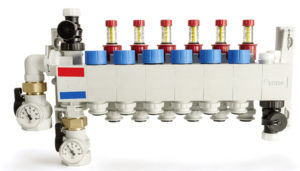 Il collettore Hkv P Speed è dotato di misuratori di portata installati su ogni circuito del gruppo di mandata, di valvole termostatizzabili sulla barra del ritorno e di un modulo terminale con rubinetto di scarico impianto e valvola per lo sfiato aria manuali.