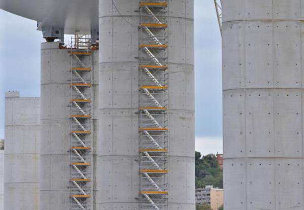 La soluzione tecnologica adottata sia per le pile (39 m di altezza e una sezione ellittica di 9,50 x 4,00 metri) sia per i relativi baggioli, è stata Vario Gt24, cassaforma per pareti componibile con trave reticolare Gt24: un sistema versatile e adatto alle realizzazioni di elementi costruttivi in calcestruzzo faccia a vista. Per l’elevazione sono state quindi impiegate cinque unità di cassaforma, con cicli di getto di 4,50 m di altezza e 2 unità per la realizzazione della rampa di accesso.