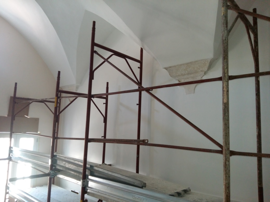 Sempre sullo scalone si è intervenuti sulla cornice barocca in pietra leccese, un tempo ricoperta da intonaco (come dalle tracce rinvenute nei saggi), presentava la superfice lapidea molto danneggiata proprio in seguito ai lavori di pulizia e rimozione dell’intonaco effettuati in maniera molto grossolana. Per tale motivo è stato necessario intervenire prima con la pulizia e la rimozione con bisturi dei scialbi presenti, la stuccatura delle giunture e di alcuni punti sbeccati, poi l’equilibratura cromatica mediante il latte di calce e la finitura con cera microcristallina.