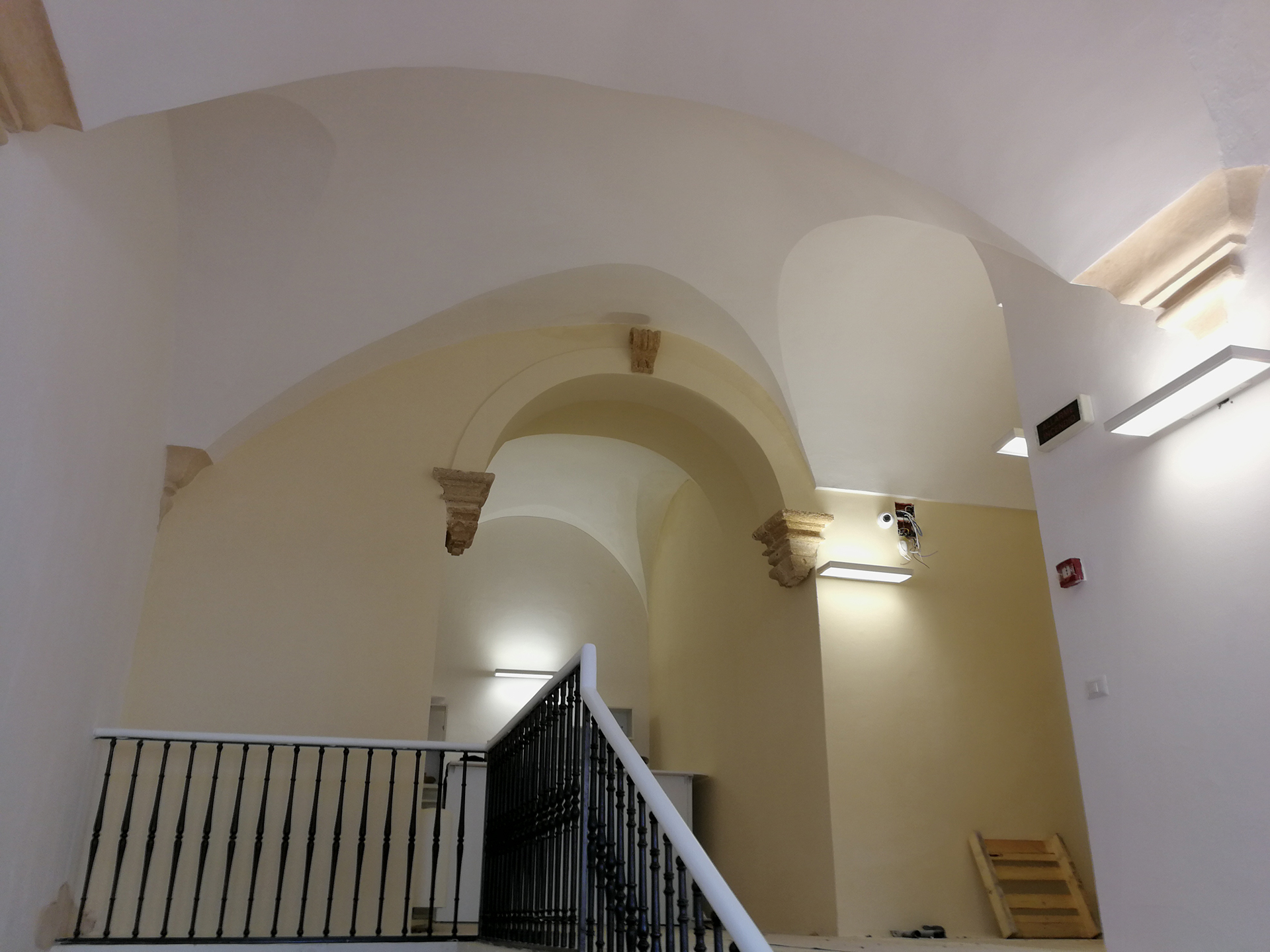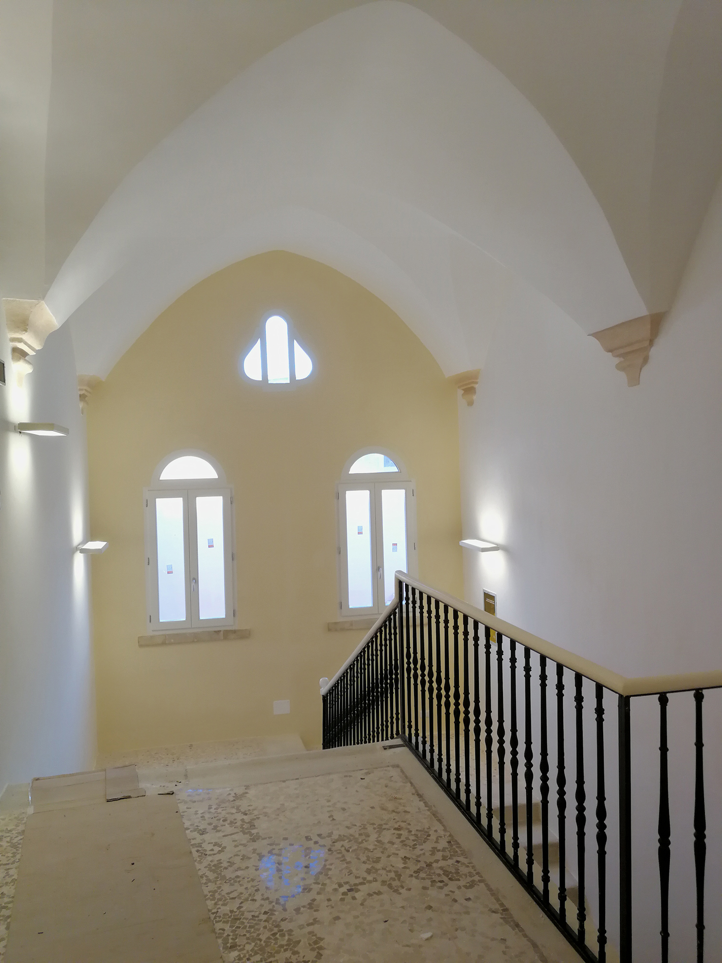 Anche le facciate interne presentavano un diffuso fenomeno di distacco dell’intonaco (cementizio) e ampie tracce di umidità di risalita e pluviali rotti. Varcato il portone d’ingresso si percorre una prima rampa di scale per arrivare a un pianerottolo su cui si apre l’ingresso di un locale, oggi adibito a bagno ma che un tempo collegava con il chiostro del convento, e una nicchia con pregevole cornice barocca in pietra leccese molto danneggiate che un tempo probabilmente doveva contenere una tela.