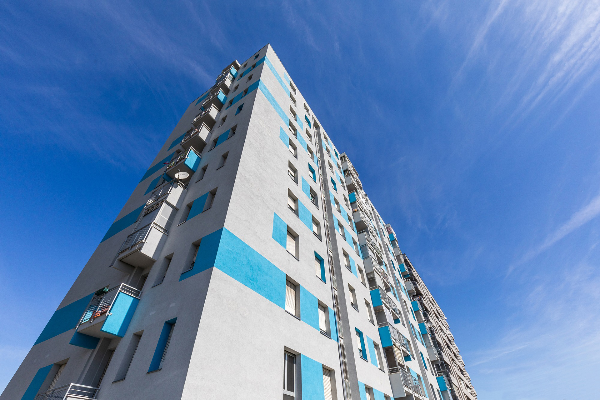 L’opera di termocappotto non si è fermata a un semplice isolamento delle pareti e dei solai perimetrali, ma ha riguardato anche la finitura esterna dell’immobile per cui è stato usato un colore grigio chiaro sul quale sono stati alternati degli elementi geometrici di colore azzurro volti a valorizzarne l’estetica.