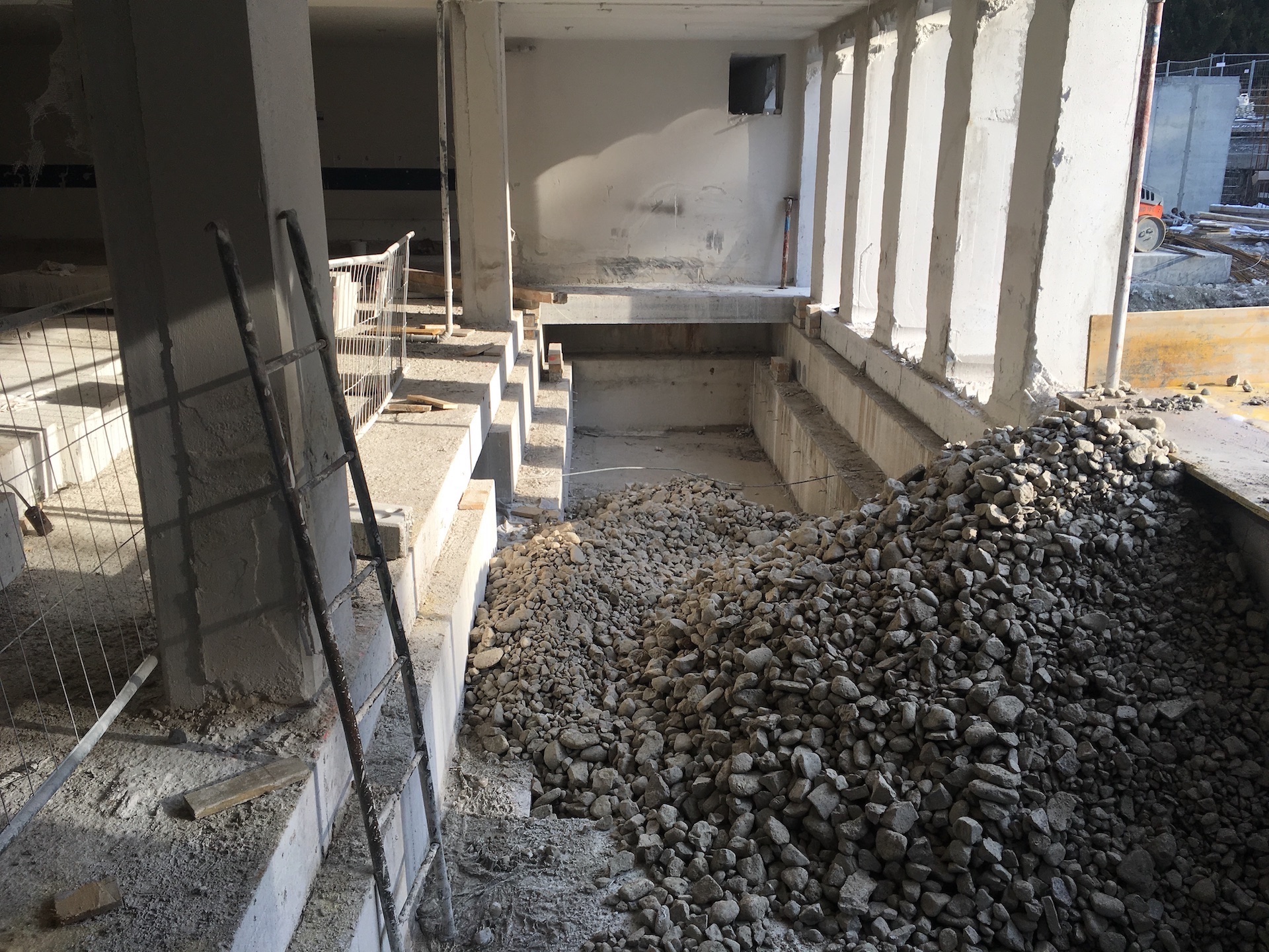 Nella zona liberata dallo scavo, si è realizzato, con l’ausilio di nuove opere di fondazione in calcestruzzo e una nuova struttura in elevazione la creazione di un ampliamento delle superfici interne, in cui accogliere la prima parte delle vasche della nuova piscina. Lo spazio superiore di quest’ampliamento ha consentito altresì di ampliare le superfici della balconata che fronteggia lo spazio ristorante al piano terreno.