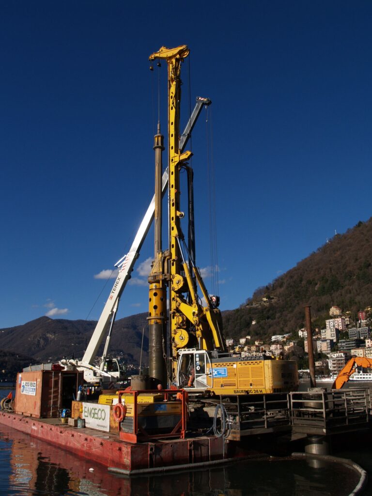 «All’interno dell’associazione d’imprese che sta realizzando l’opera, noi ci occupiamo esclusivamente dei lavori di fondazione le vasche di accumulo appoggiano su una platea posta 4-5 m sotto il livello dell’acqua e necessitano di fondazioni in quanto i terreni sottostanti, come portanza, sono piuttosto inconsistenti. Ragion per cui le vasche prevedono 84 pali da 1.000 mm di diametro, profondi mediamente 25 m dalla quota fondale e realizzati operando da mezzi galleggianti. E questo specifico particolare crea qualche difficoltà, soprattutto di piazzamento, anche se, fortunatamente, il Lago di Como è uno specchio d’acqua piuttosto calmo. Per la realizzazione dei pali procediamo con un rivestimento provvisorio e utilizziamo un’asta con benna per l’estrazione del terreno. Giunti in quota, cioè 25 m sotto il livello del fondale, inseriamo le gabbie di armatura e procediamo con il getto di calcestruzzo partendo dal fondo del palo, attraverso un tubo da 30 cm di diametro assemblato con il rivestimento e portato a fondo scavo. Il calcestruzzo, risalendo, va a espellere l’acqua che entra in fase di scavo. Infine si recupera il rivestimento per un nuovo utilizzo. Da segnalare come la maglia dei pali sia piuttosto particolare, quasi una freccia composta da tre file di pali: le due esterne, distanti circa 6 m, coincidono, mentre la fila centrale risulta sfalsata dando alla maglia una forma pressoché triangolare. La macchina, la nostra Bauer BG24 che in apparenza poteva sembrare sottodimensionata per un 1.000 rivestito spinto fino a 25 m, in realtà si sta comportando molto bene. Si tratta di una perforatrice del 2007 con oltre 9.000 ore di lavoro, che opera egregiamente e che in genere utilizziamo per realizzare pali rivestiti. Prima di questo lavoro l’abbiamo impiegata in Calabria per la realizzazione di pali di fondazione rivestiti per una stazione elettrica Terna. In tutti questi anni ha sempre svolto il suo lavoro e continua a farlo».