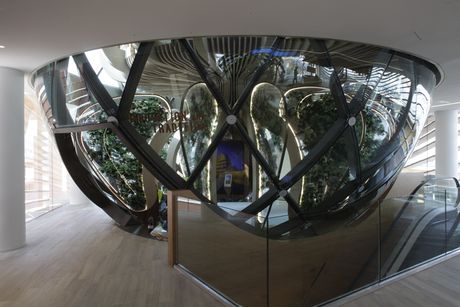 Il vetro Planibel Linea Azzurra di AGC Glass Europe è stato utilizzato per le sfere, le parti piane della facciata e i parapetti interni (foto FRomano)
