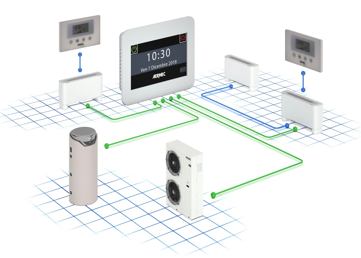 All’interno di questo percorso, Aermec, azienda italiana che dal 1961 realizza soluzioni per il benessere e il comfort in tutti gli ambienti dove si vive e si lavora, presenterà il Sistema VMF: il Sistema di Controllo e Gestione dell’Impianto idronico di Climatizzazione, Riscaldamento, produzione di Acqua Calda Sanitaria e Recupero di Calore. Il Sistema VMF coniuga Comfort, Versatilità, Efficienza Energetica ed è compatibile con l’intera gamma di prodotti Aermec, tra i quali: