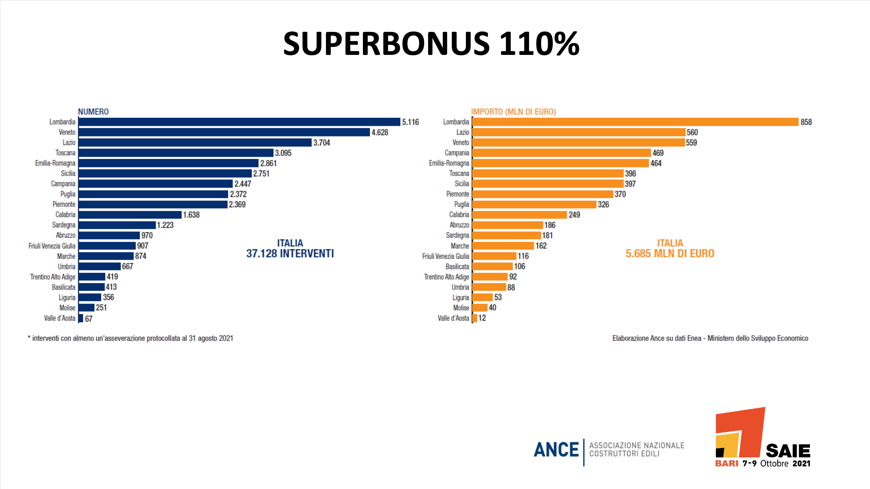 A livello di distribuzione regionale, si evidenziano nelle prime posizioni Lombardia (5.116 interventi per un valore di €858mln), Veneto (4.628, €559mln), Lazio (3.704, €560mln) e seguiti a breve distanza dalla Toscana (3.704, €398mln) e dall’Emilia-Romagna (2.861, €464mln). Da rilevare anche le ottime performance di quattro regioni meridionali, Sicilia (2.751, €397mln), Puglia (2.372, €326mln), Campania (2.447, €469mln) e Calabria (1.638, €249 mln). In questo contesto diventa fondamentale rendere sistemico il Superbonus con una proroga almeno fino al 2023. Saie dedicherà proprio al Superbonus 110% il convegno inaugurale, organizzato in collaborazione proprio con Ance, dal titolo “Stati Generali del Superbonus 110% e degli altri incentivi fiscali” e tanti altri momenti di approfondimento.