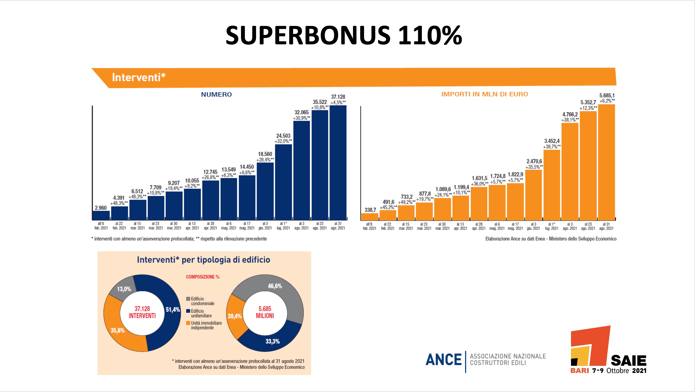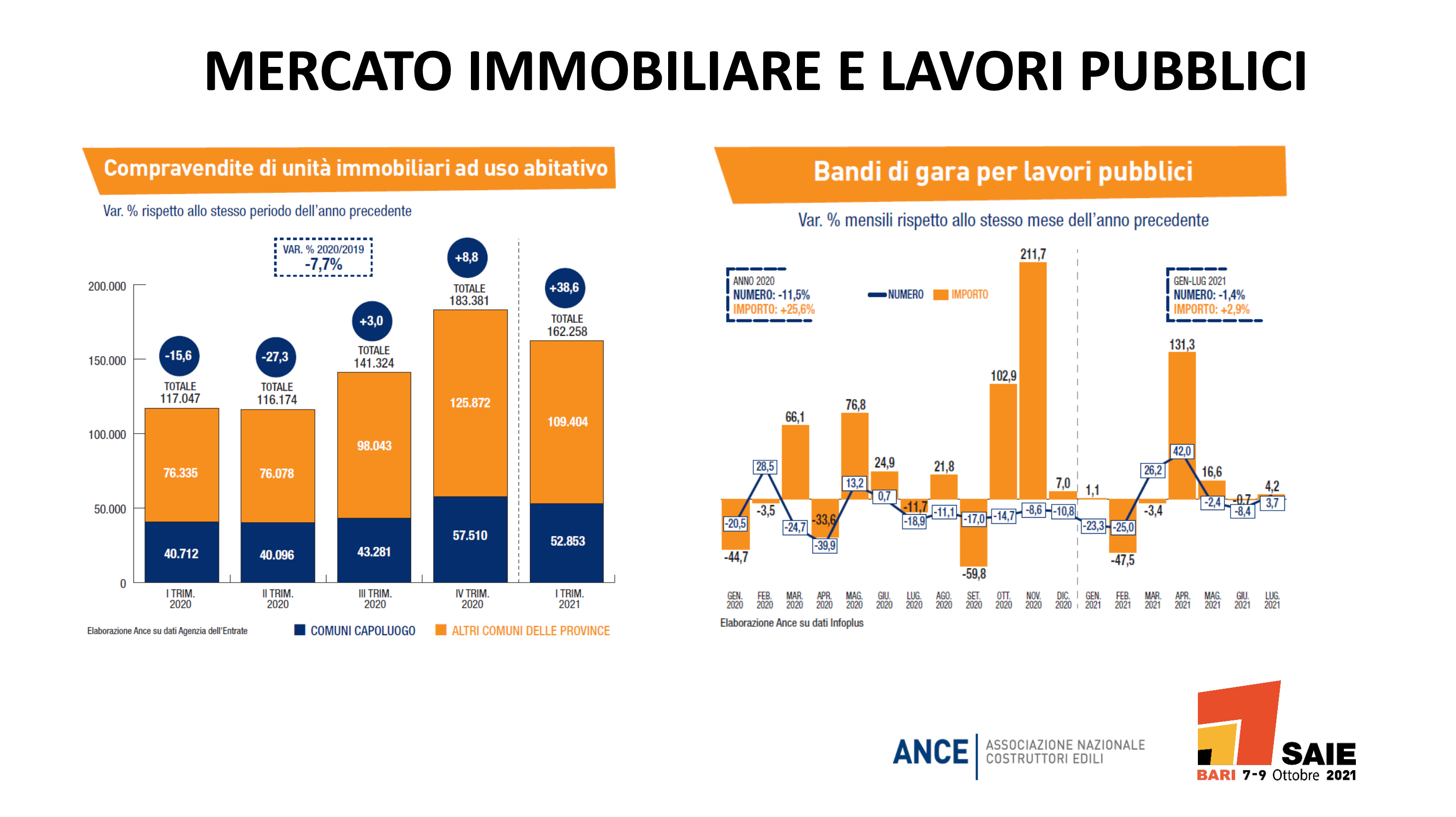 L’accelerazione del settore edile non si è interrotta neppure durante l’estate. I dati, elaborati da Ance, illustrati in occasione della conferenza stampa di presentazione di Saie Bari 2021, la Fiera delle Costruzioni (dal 7 al 9 ottobre 2021 presso la Nuova Fiera del Levante) parlano chiaro: continuano a crescere tutti i principali indicatori (Elaborazione Ance su base dati Agenzia delle Entrate, Enea, Ministero dello Sviluppo Economico, Istat, Infoplus),dal mercato immobiliare agli investimenti, dai lavori pubblici agli interventi realizzati grazie al Superbonus 110%.