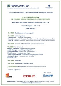 Nell’ambito del Saie Bari, si è tenuto nella giornata di sabato 26 ottobre 2019 il convegno “Il magazzino edile al centro della filiera delle costruzioni”, che, organizzato da Federcomated, ha visto la partecipazione di numerosi distributori edili e di esponenti delle associazioni territoriali non solo del Sud ma di tutta le Penisola. Si è trattato del primo Convegno organizzato nel capoluogo pugliese, in un contesto fieristico, infrastrutturale e cittadino all’insegna della riqualificazione, della rinascita e dello slancio verso un’imprenditorialità attenta ed evoluta, con sempre più voglia di crescere e di affermarsi nell’attualità del mercato e dell’epoca di grandi cambiamenti che stiamo vivendo.