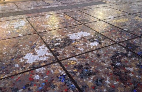 Dopo essere state posate, le tessere in marmo, granito e smalto veneziano risultavano sporche e rovinate dai residui di posa, dalle condizioni metereologiche e dal calpestio: in soli 15 giorni di lavoro era necessario riportare la pavimentazione alla bellezza originale dei materiali che la compongono.