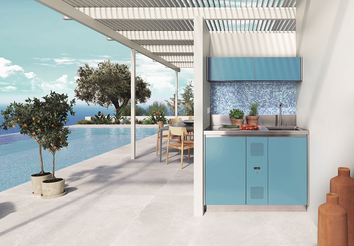 La casa di Mykonos, caratterizzata da un’atmosfera rilassata e ricercata, ospita nel patio a bordo piscina Cooling Station ovvero la nuova stazione fredda di Abimis. Cooling Station è realizzata in acciaio AISI 316 ed è caratterizzata da una piccola vasca, frigorifero e da un fabbricatore del ghiaccio, mentre nella parte superiore troviamo dei pensili per lo stoccaggio di bicchieri e bottiglie. La superficie può essere verniciata in acciaio lucido o opaco, oppure in qualsiasi tonalità RAL per adattarsi meglio al contesto che ospita la stazione fredda.