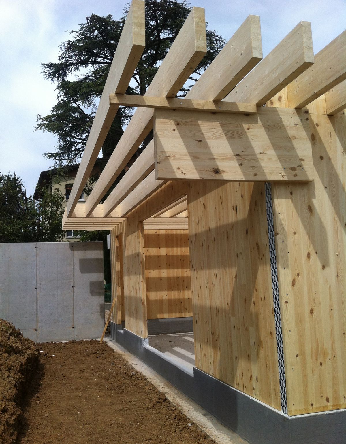 Per la realizzazione delle strutture in elevazione sono state impiegate pareti in legno lamellare a strati incrociati essiccato artificialmente con umidità del 12% (X-Lam 9 cm di spessore a 3 strati). La disposizione incrociata delle lamelle longitudinali e trasversali di queste pareti permette di ridurre al minimo i fenomeni di rigonfiamento e ritiro del pannello aumentandone la resistenza statica e la stabilità dimensionale. Per l’incollaggio dei vari strati di assi viene impiegato il collante Pur Purbond HB 110 Collano, privo di solventi e formaldeide. Questo prodotto è testato in base alla norma Din 68141 e agli ulteriori criteri stabiliti dalla Fmba del Baden-Wurtemberg, Istituto Otto Graf di Stoccarda approvato per la produzione di elementi portanti per l’edilizia in legno in base alla norma Din 1052 – En 301. La giunzione tra un pannello e l’altro avviene tramite viti; scelta tecnica che permette alla struttura di assorbire e compensare i movimenti ondulatori-sussultori, distribuendo il carico in più direzioni (effetto a disco).