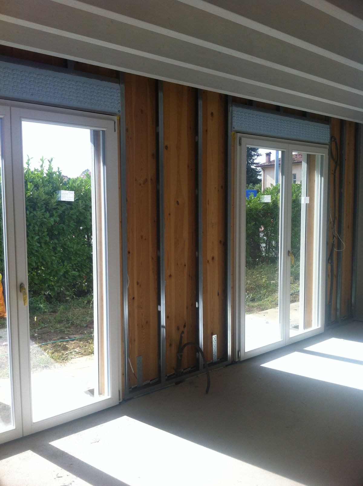 I serramenti sono stati realizzati in legno di mogano lamellare telaio 80×82 mm a doppia spina, anta 80×80 a doppia spina, chiusura a 3 battenti, 2 guarnizioni perimetrali su anta, profilo in alluminio inferiore con scarico acqua integrato, chiusura con notolini con spostamento a nastro (standard agb), doppia camera triplo vetro 40 mm (3/3+12+4+12+3/3 b.e.+ gas – trasmittanza vetrocamera Ug=0.8); fermavetro interno con punto nascosto, bisigillatura vetrocamera interno esterno, verniciatura ecologica a base acqua (una mano d’impregnante battericida e funghicida a immersione, 2 mani di finitura Ral 9010 a spruzzo garanzia 4 anni). Oscurante esterno con cassonetto a scomparsa, tapparella in alluminio a comando elettrico nelle tre finestre zona notte. Oscurante a scomparsa in pvc, nelle tre finestre zona giorno. Vetro Energy nelle tre finestre rivolte a sud. Zanzariere su tutte le finestre. Tutto certificato Ce.
