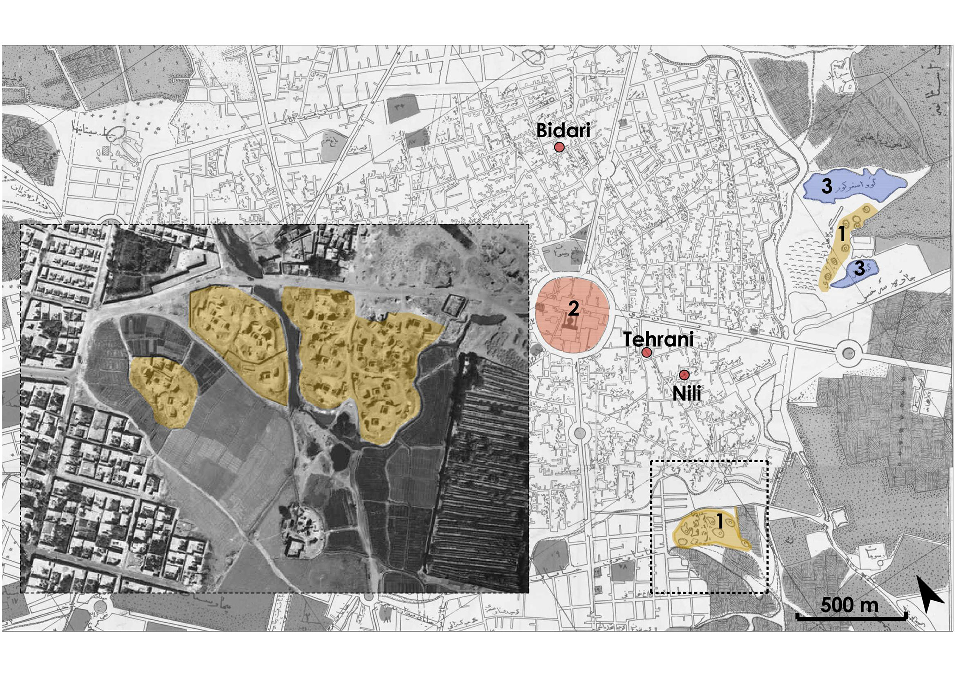 In corrispondenza della mappa della città di Mashhad (1954) sono indicate: le fornaci tradizionali cilindriche (1); il Santuario dell’Imam (2), attorno a cui si sviluppa il nucleo antico della città; le cave di argilla (3) a sud-ovest della città; le abitazioni Bidari, Tehrani e Nili oggetto di questo studio. Inoltre, in una foto aerea del 1956 sono indicate le fornaci tradizionali più estese in prossimità del Santuario dell’Imam.