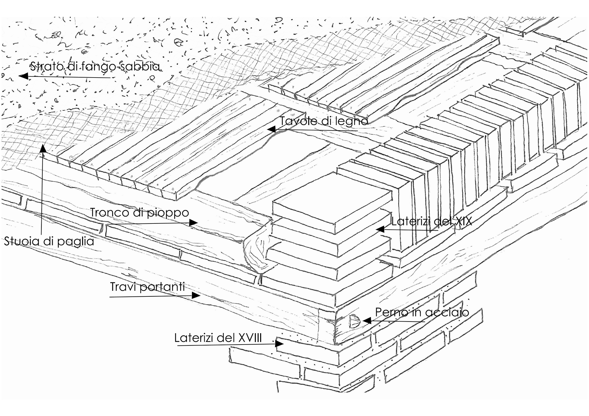 L’osservazione al microscopio ottico dei campioni di laterizi del XVIII e del XIX secolo, evidenzia l’esistenza di micro-frammenti di mattoni e sabbia sottile nella miscela di argilla. Tali tracce sono visibili anche all’interno dell’impasto delle malte, costituite soprattutto dagli aggregati finemente macinati gessosi o sabbiosi con frammenti di fillosilicati e microfossili3.