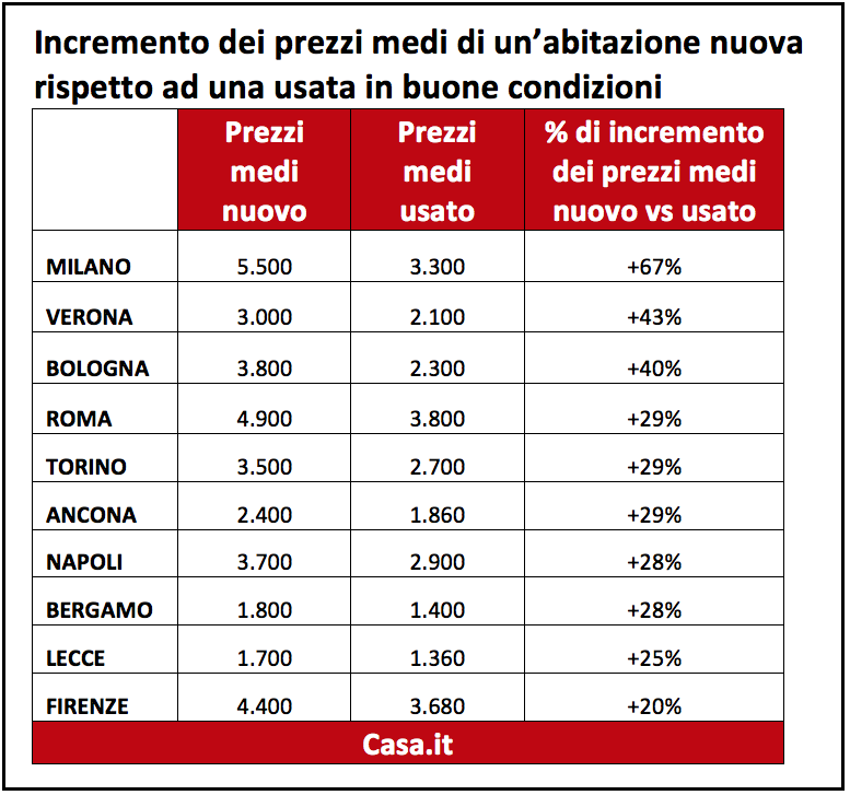 Meglio puntare sulla sicurezza del nuovo o sul “fascino” dell’usato? Quanto si spende per un’abitazione nuova rispetto ad una “già vissuta”? Una risposta arriva dal Centro Studi di Casa.it, che ha messo a confronto i prezzi di vendita medi delle singole abitazioni nuove con quelli degli appartamenti usati, nelle dieci città italiane maggiormente interessate da nuove costruzioni. Se in media a livello nazionale acquistare un appartamento nuovo costa circa il 25/30% in più rispetto ad uno in buone condizioni, si registrano differenze significative tra le singole città e soprattutto in base alla “dinamicità” della zona. A livello generale Milano (+67%), Verona (+43%) e Bologna (+40%) sono le città in cui il nuovo ha un prezzo medio decisamente più alto rispetto all’usato, mentre al contrario troviamo Firenze, dove questo incremento è ridotto al +20%.