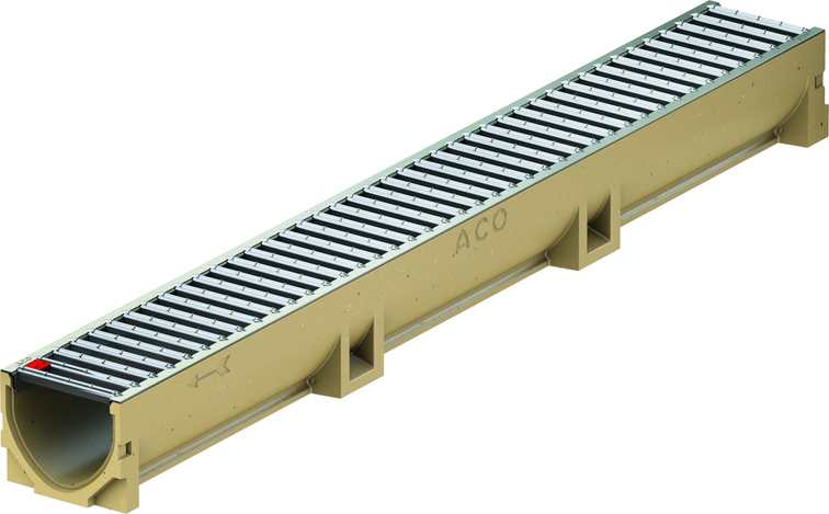 Aco Compasso C 200 Z basso spessore è un canale con sezione di invaso a U, dalla larghezza di 200 mm, con fondo arrotondato e dotato di preforma dello scarico verticale e di bordi sporgenti per grigliati a incasso. La struttura fisica dei grigliati a incasso permette che tutti gli elementi portanti del grigliato vadano ad appoggiare sul corpo canale, creando tra i due fianchi di quest’ultimo una sorta di “ponte” dall’elevata resistenza meccanica che fa sì che il canale possa sopportare sollecitazioni di compressione dovute a carichi pesanti.