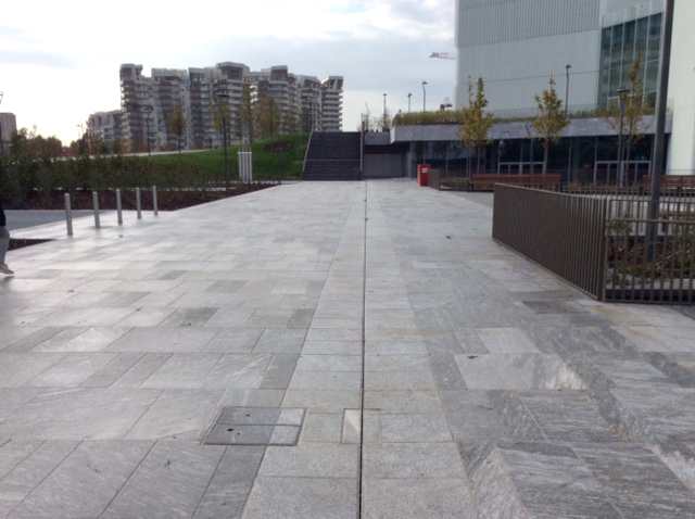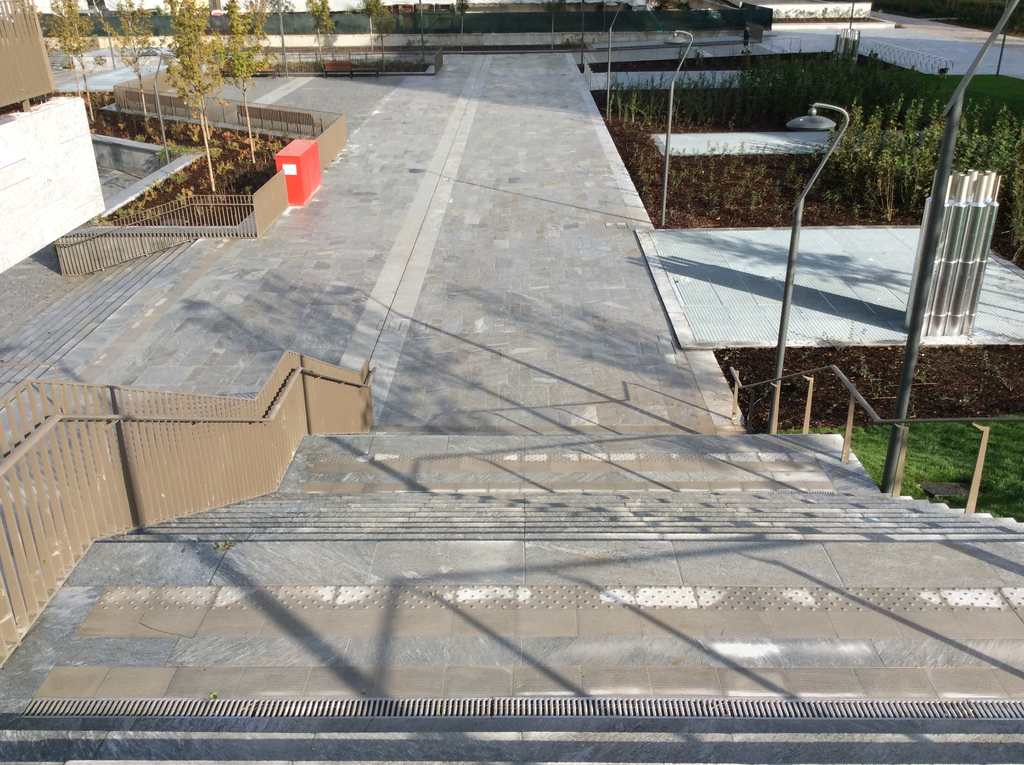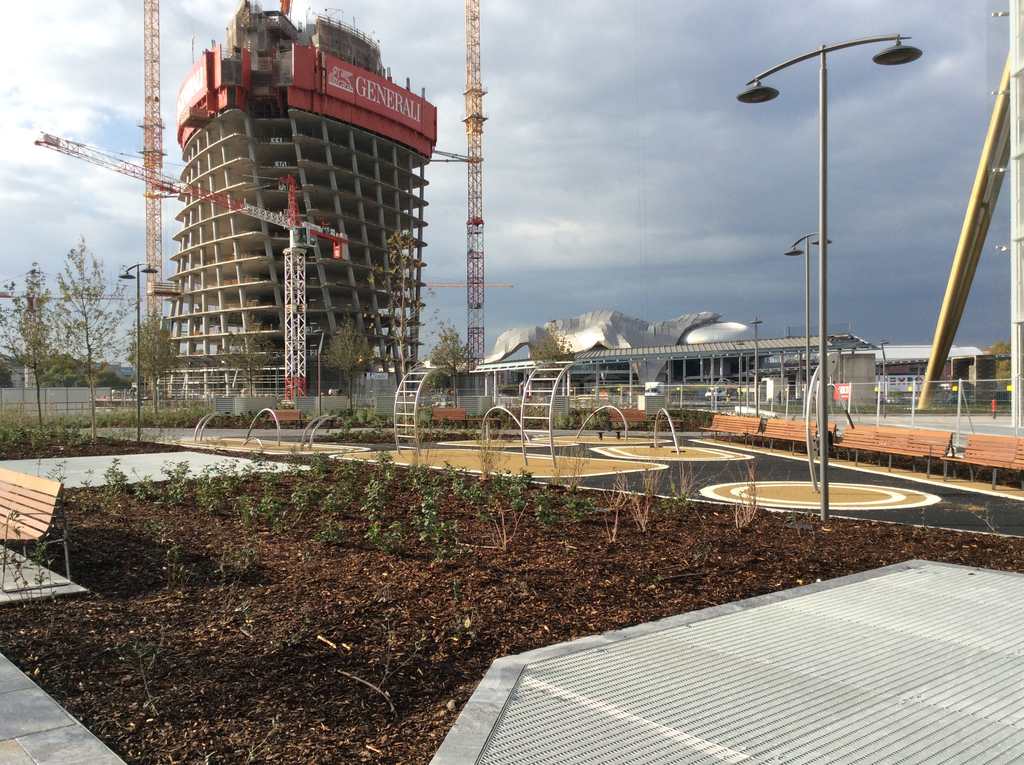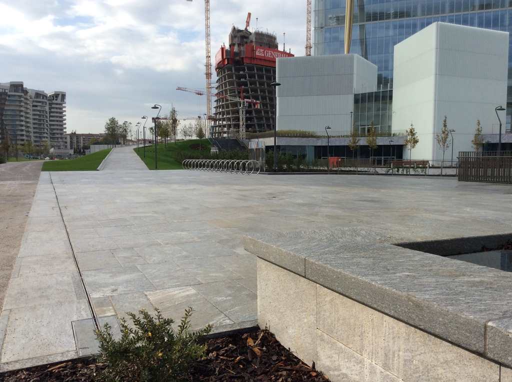 Un’area pubblica concepita in ottica moderna dal punto di vista urbanistico e ambientale; uno spazio multifunzionale che ha richiesto la realizzazione di particolari sistemi di drenaggio, soprattutto nell’area che circonda la torre Isozaki, caratterizzata da spazi verdi e aree pedonali, e per i quali i progettisti hanno scelto la tecnologia dei prodotti Aco.