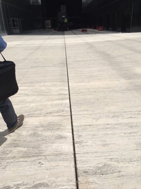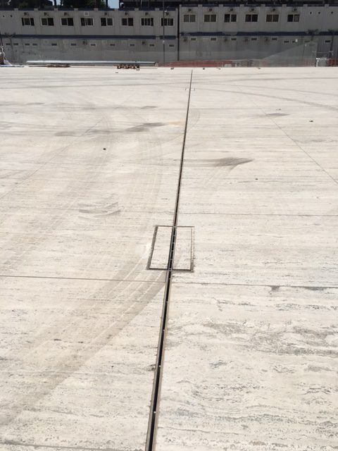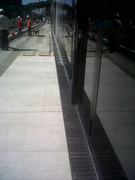 Il calcestruzzo polimerico infatti è un materiale particolarmente “liscio” che permette di aumentare la velocità di scorrimento dell’acqua e diminuire la sezione di passaggio e quindi l’ingombro del canale. Rispetto ai comuni manufatti in calcestruzzo si ha una riduzione degli ingombri di circa il 30%. La struttura “piena” e non parzialmente porosa del calcestruzzo polimerico rispetto al calcestruzzo, assicura inoltre maggiore resistenza meccanica e inattaccabilità del materiale da agenti chimici di diversa natura aumentando notevolmente la durabilità del sistema di drenaggio. A completamento del sistema di drenaggio per la pavimentazione esterna del Centro Congressi sono state utilizzate, come elementi superiori a vista, delle caditoie a fessura di tipo “L” e “T” in acciaio inox AISI 304 che rendono invisibili le linee di drenaggio.