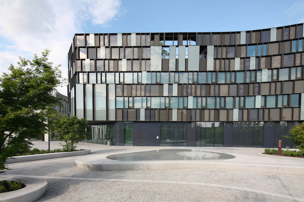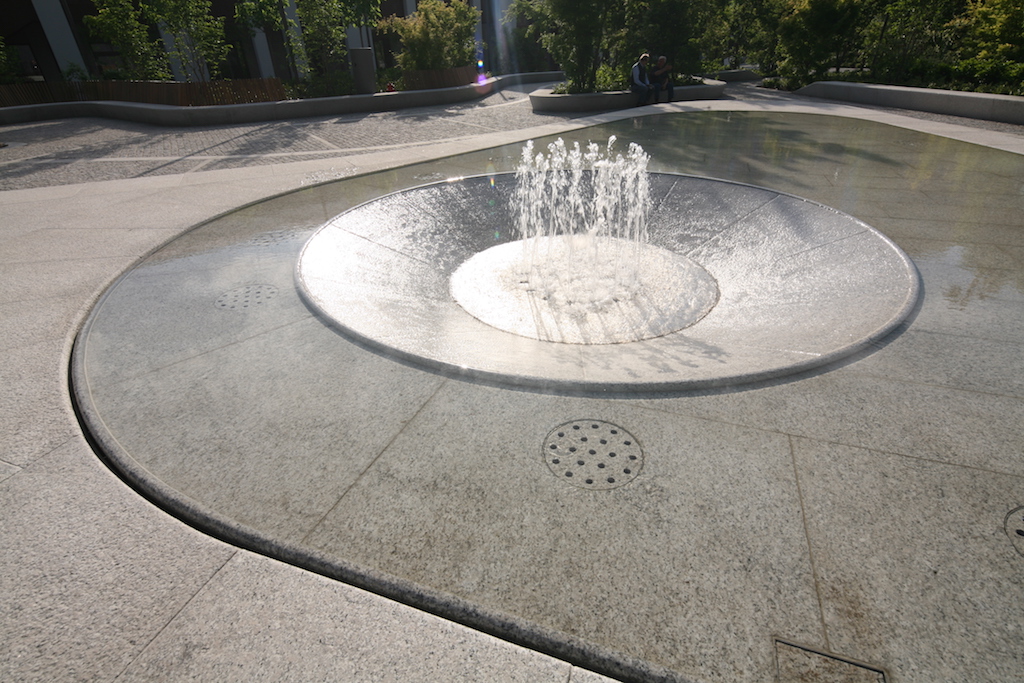 A far dialogare questi due blocchi ci pensa una piazza-giardino in cui trovano spazio lunghe panche in granito bianco sardo che emergono dal piano della pavimentazione seguendo linee sinuose che definiscono i diversi percorsi che attraversano la piazza e creano luoghi di sosta. Al centro di tutto una fontana che contribuisce alla costituzione di un microclima protetto dal rumore e dal disordine visivo della città.