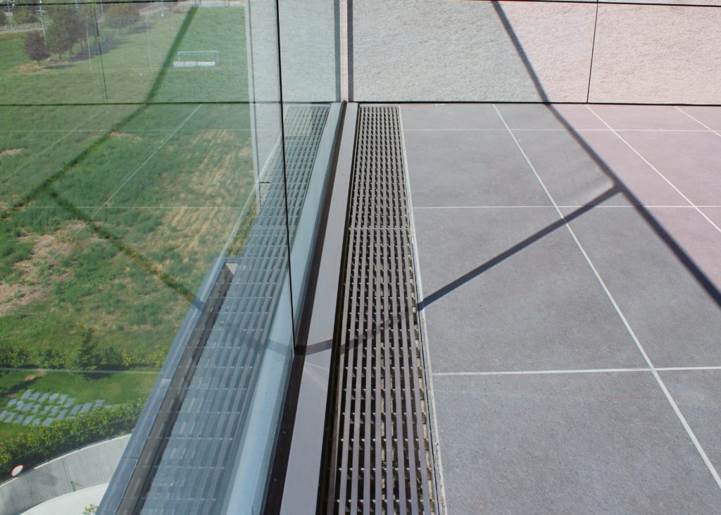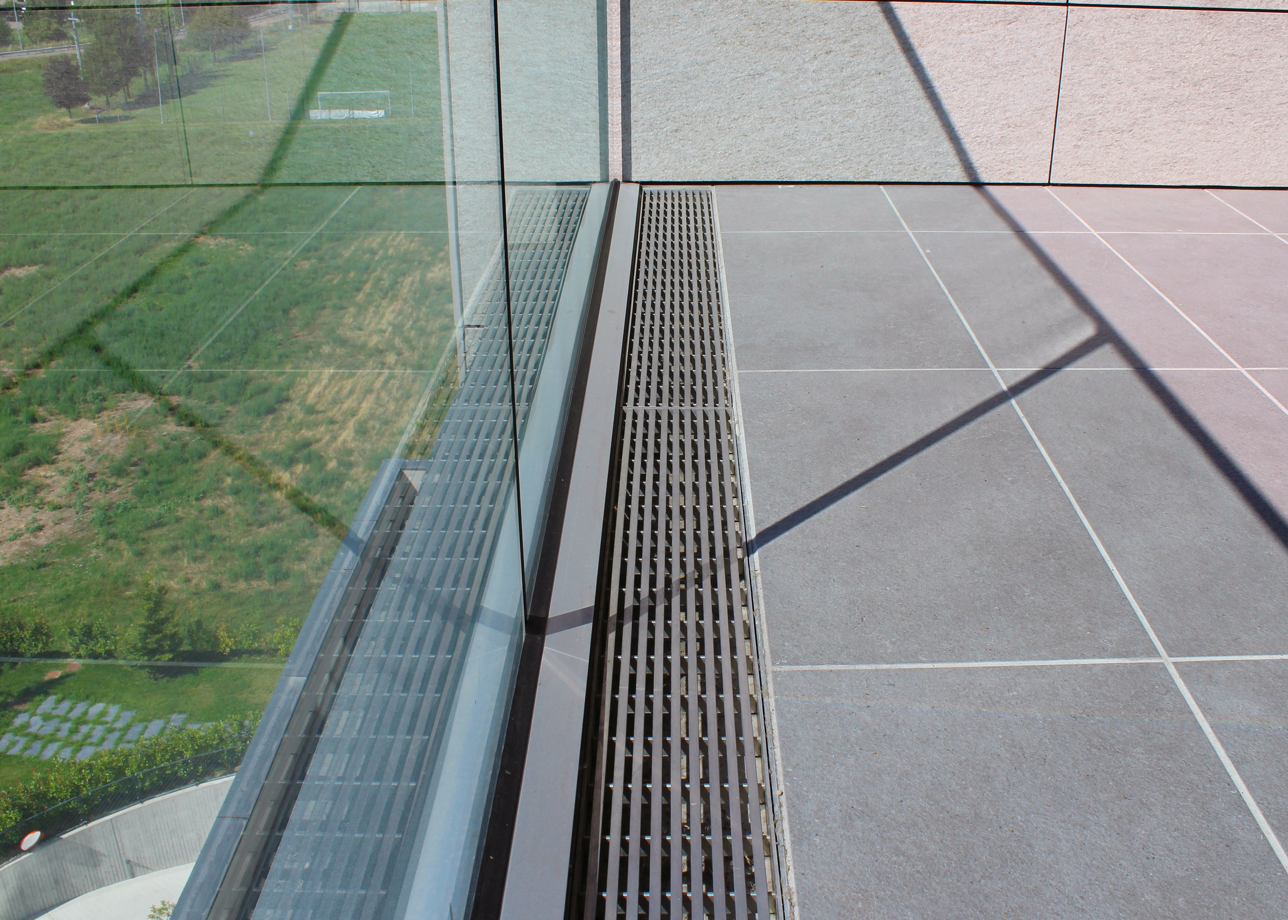 Canali Multiline sono infine stati scelti anche per la rampa di accesso al garage, dove sono stati installati i Multiline V 300, dalla larghezza nominale di 300 mm, completati con resistenti griglie a fessura longitudinale in ghisa GJS, in classe di carico D400/E600.