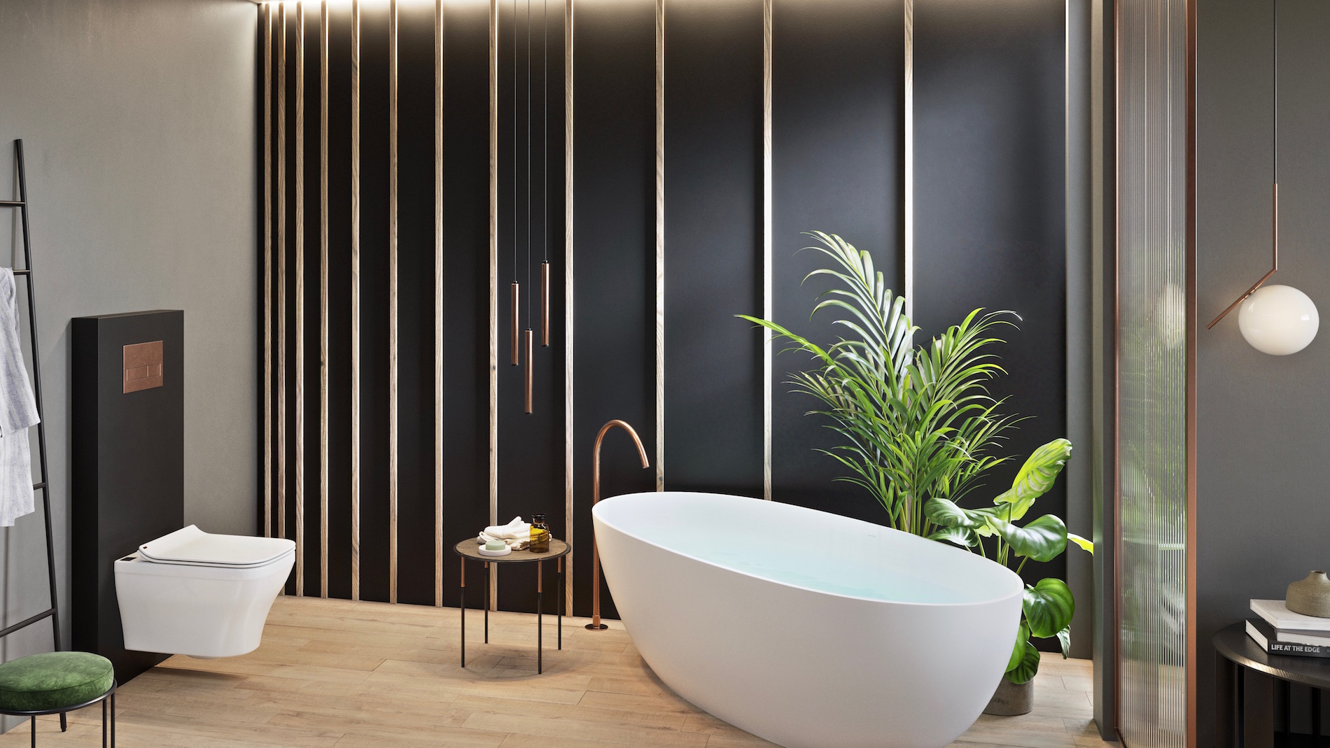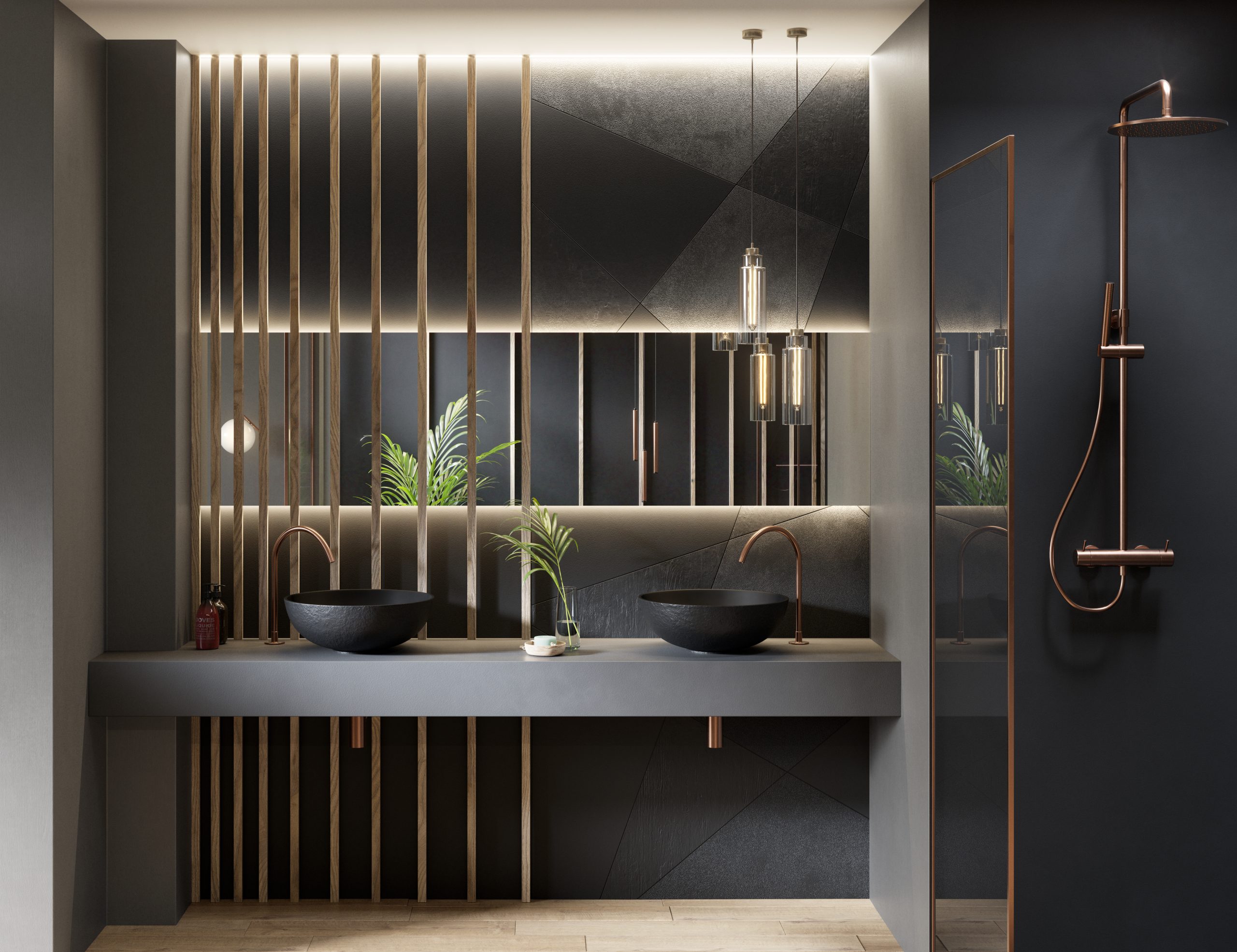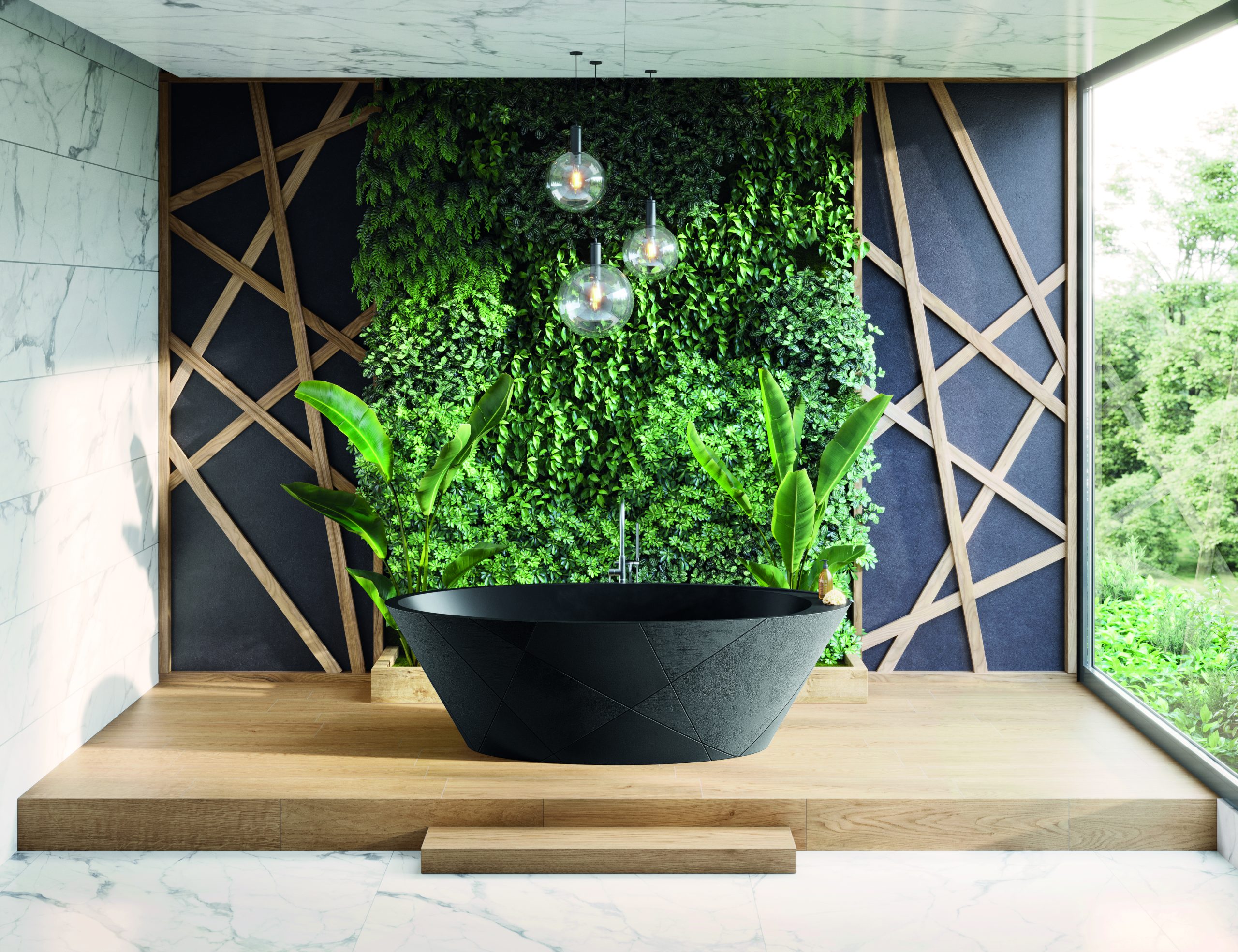 Il total black entra nella stanza da bagno creando interessanti contrasti con finiture più chiare, ma anche lucide o cromate.