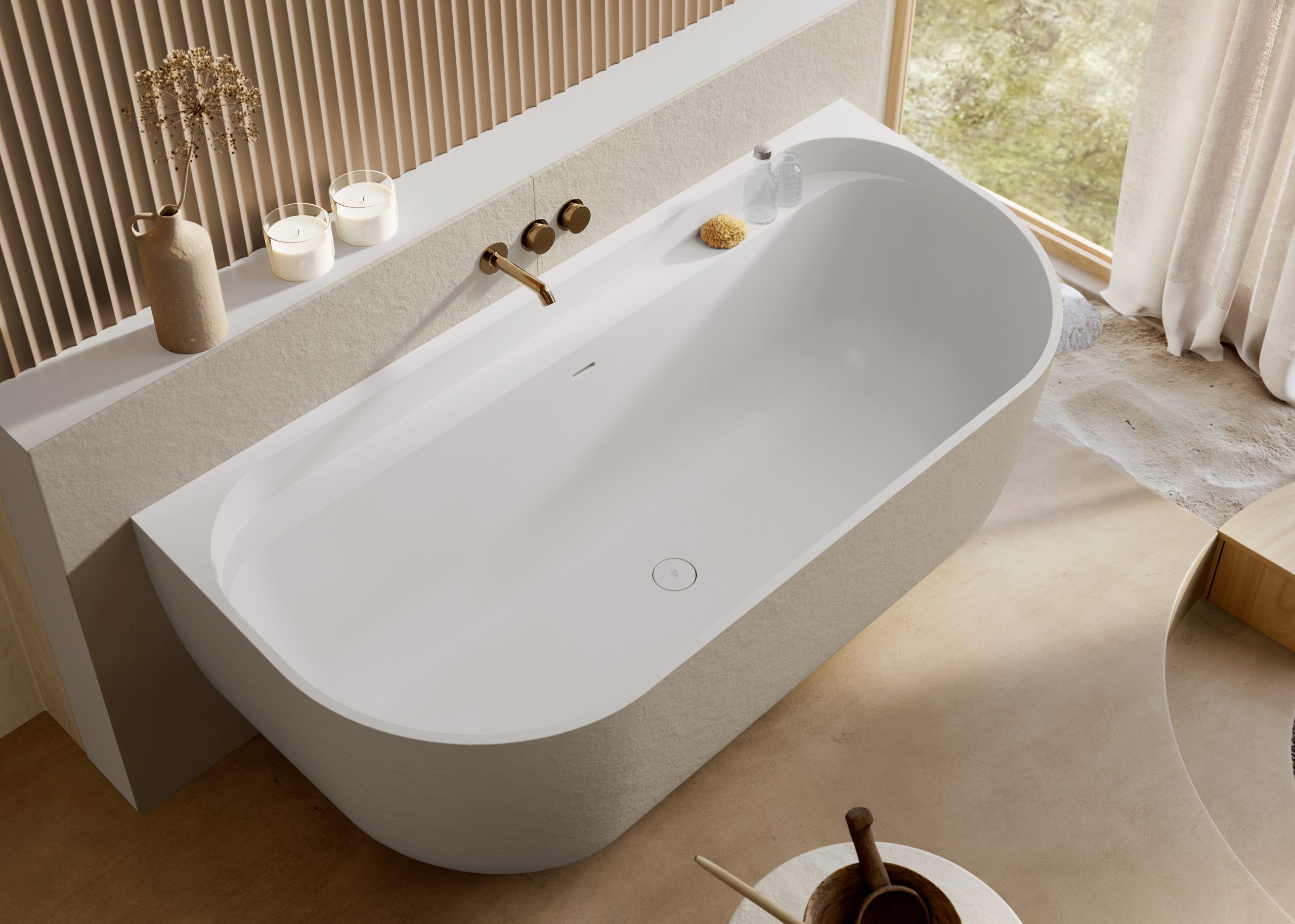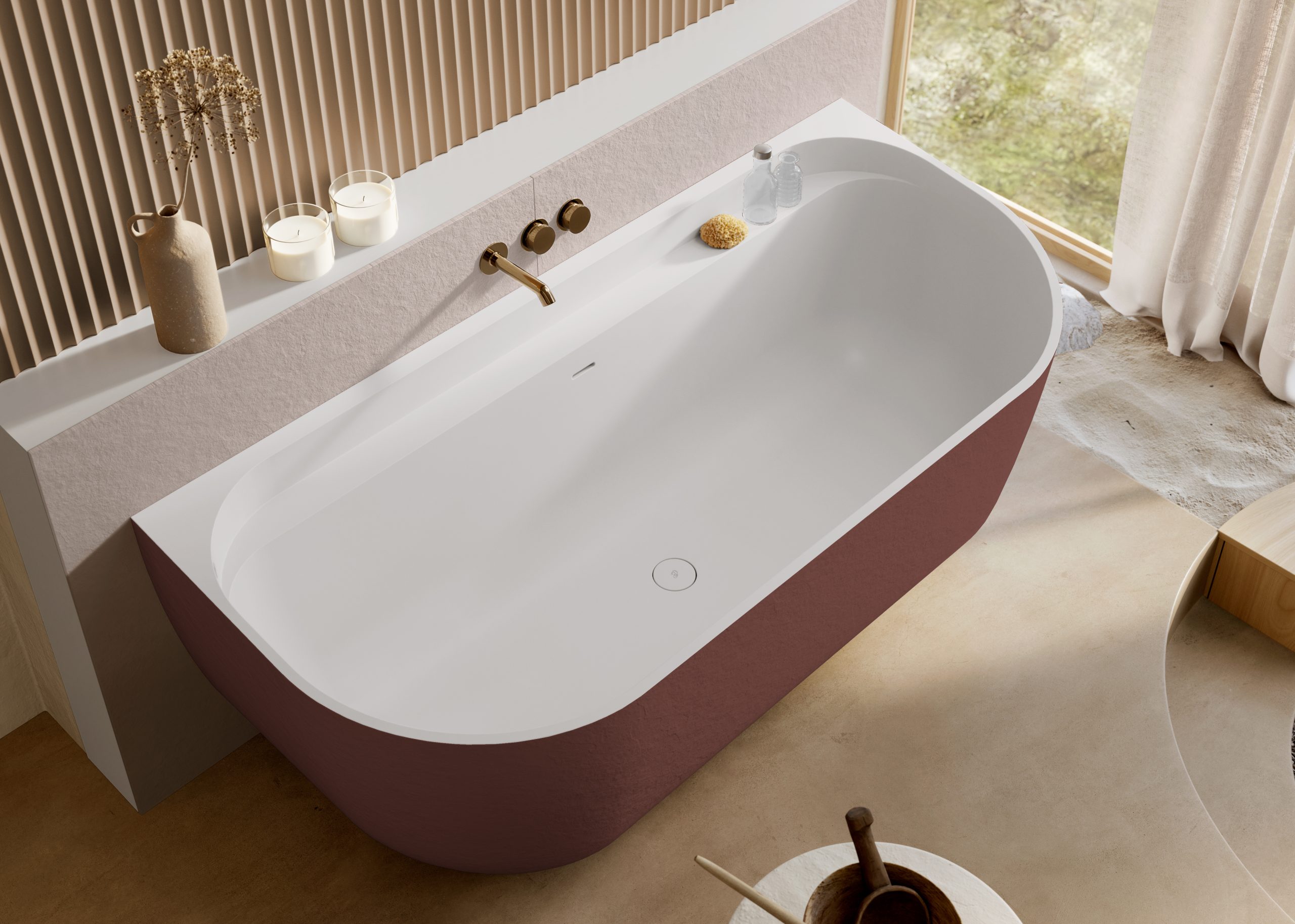 La vasca da bagno scultorea Noon Slate di Acquabella si rinnova con una nuova opzione bicromatica, offrendo la possibilità di personalizzare l’esterno con la finitura Slate in qualsiasi colore Season, Naturally Made, Standard o Ral/Ncs, abbinata a una superficie interna liscia e bianca.