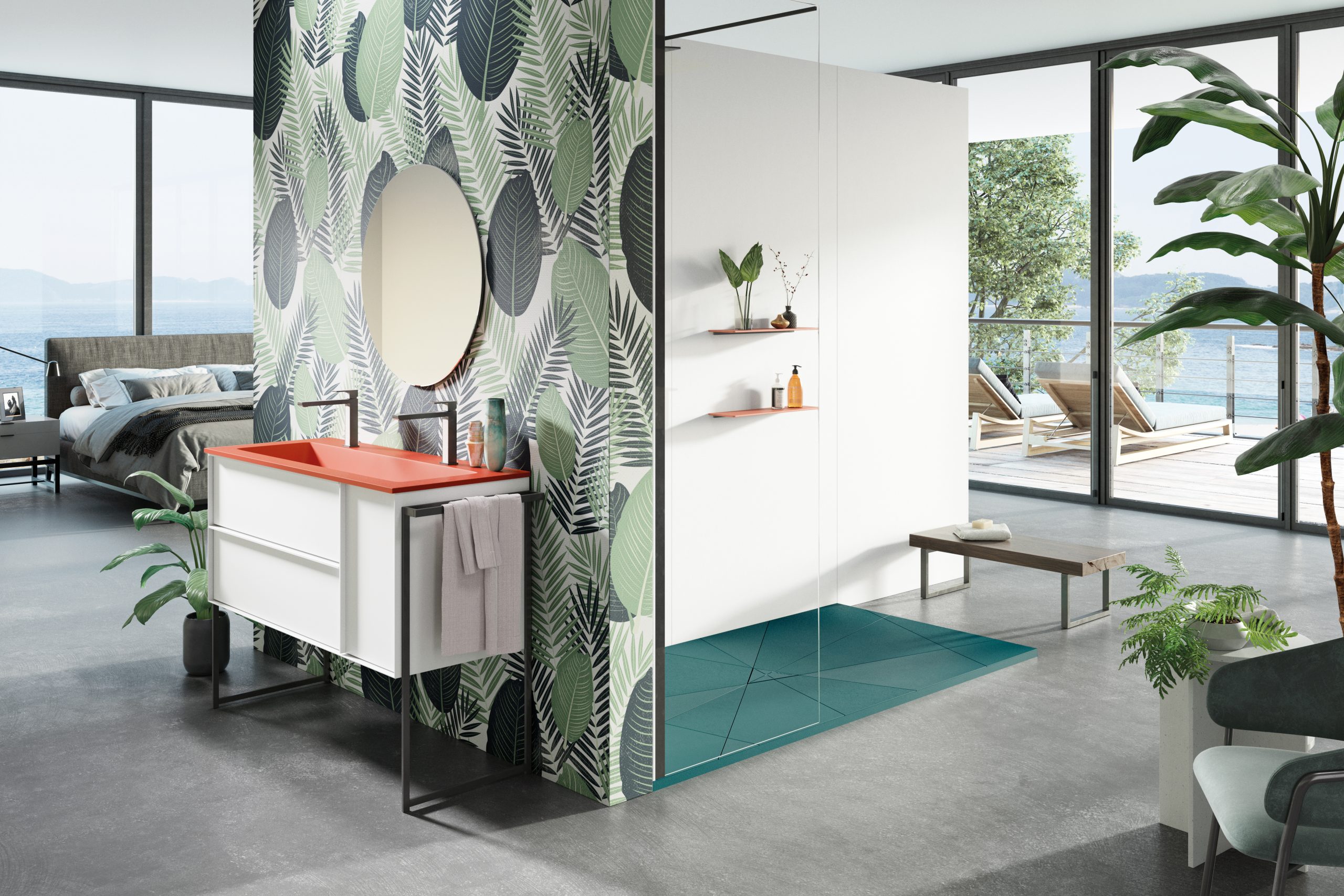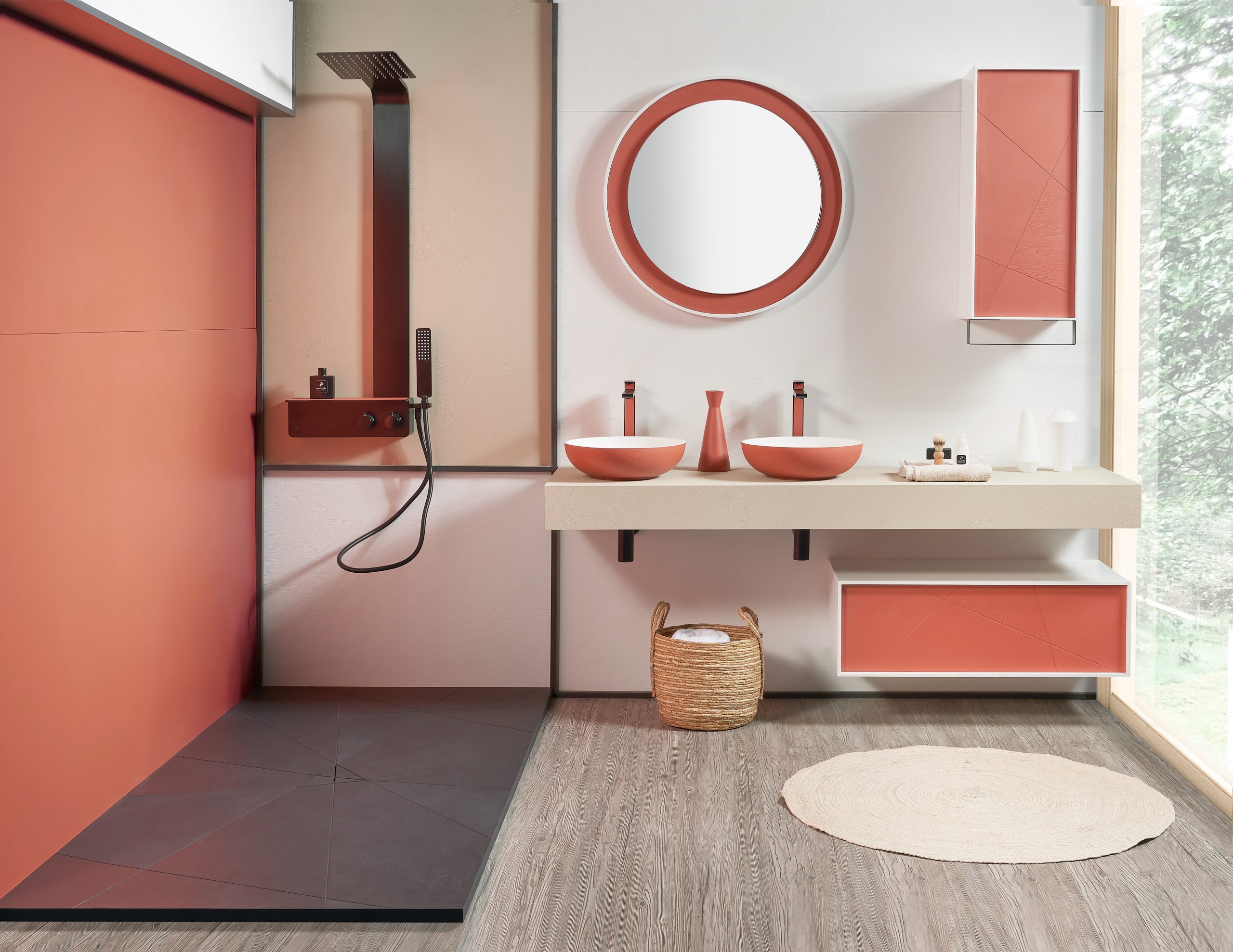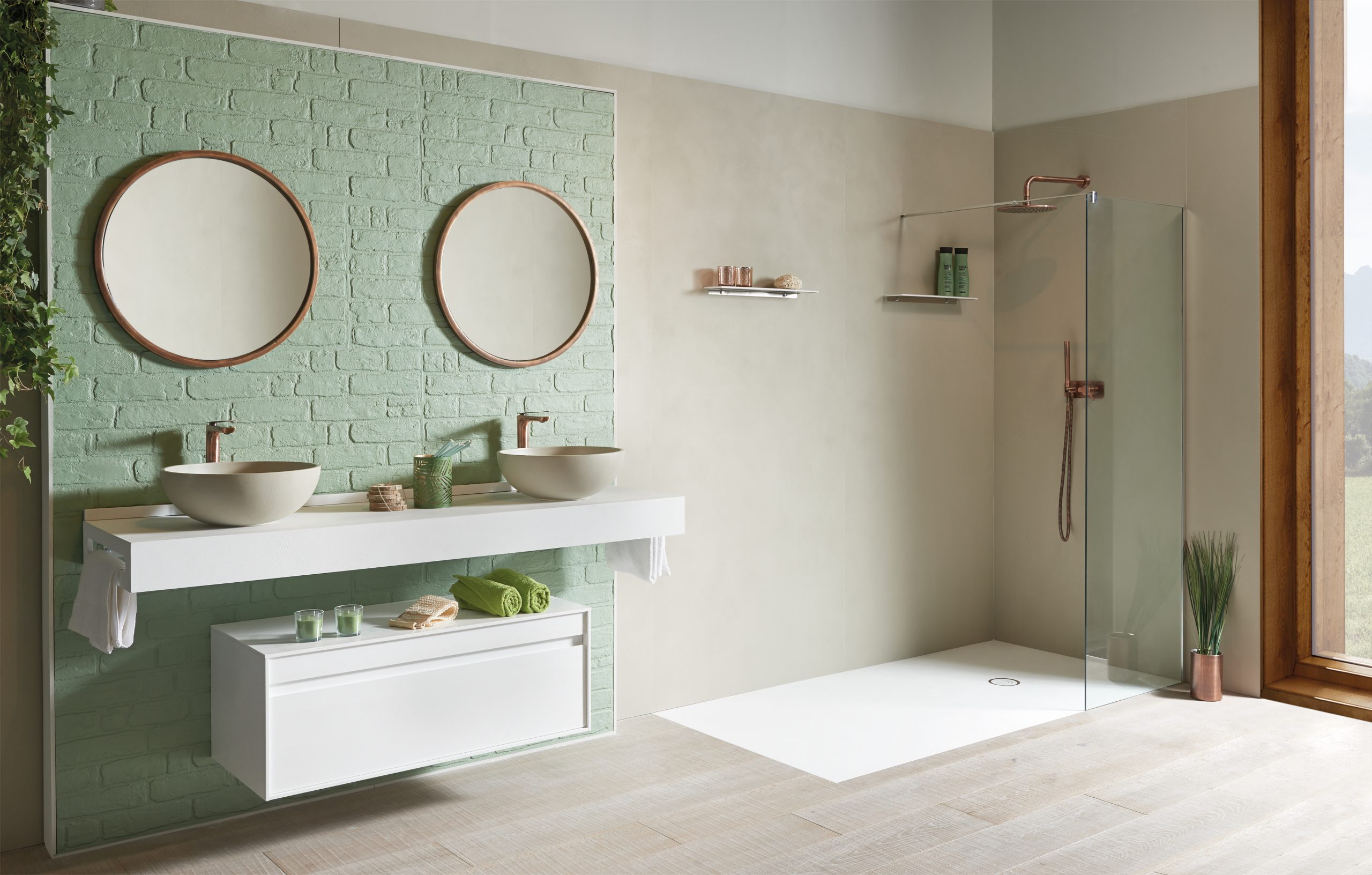 Dai lavabi, il colore si “trasferisce” ai piatti doccia, quest’ultimi tutti caratterizzati da profili eleganti e adattabilità nelle dimensioni, come nei nuovi Areia Slate Evo e Unic Slate.
