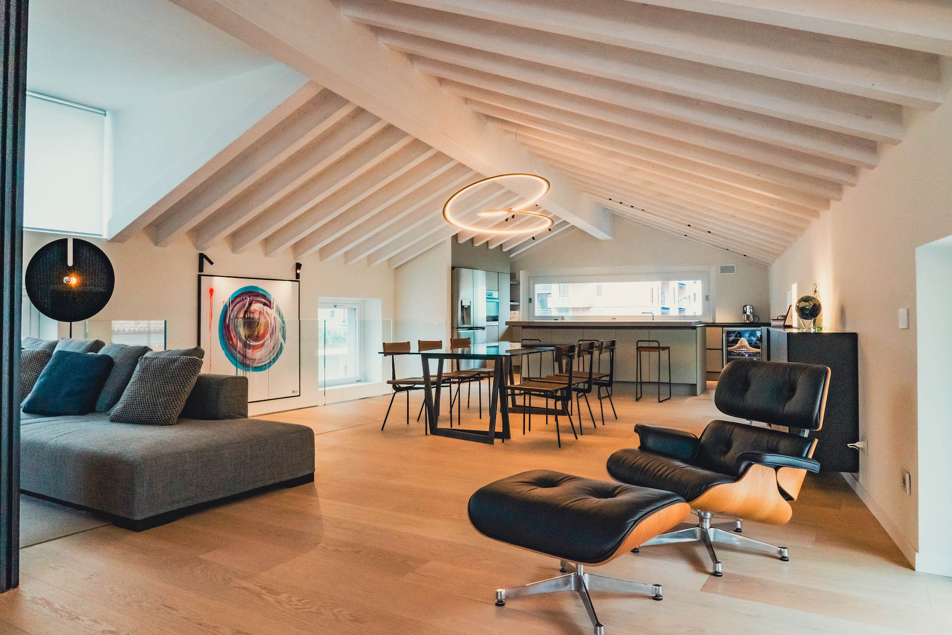 Da qui il suggerimento e la richiesta dei due proprietari di trasformate l’ultimo piano attico mansardato in una grande e luminosa zona giorno: uno spazio di circa 100 metri quadrati caratterizzato da una serie di finestrature basse lungo tutto il perimetro e due grandi aperture più alte che illuminano rispettivamente la zona che ospita la cucina a vista e la zona living.