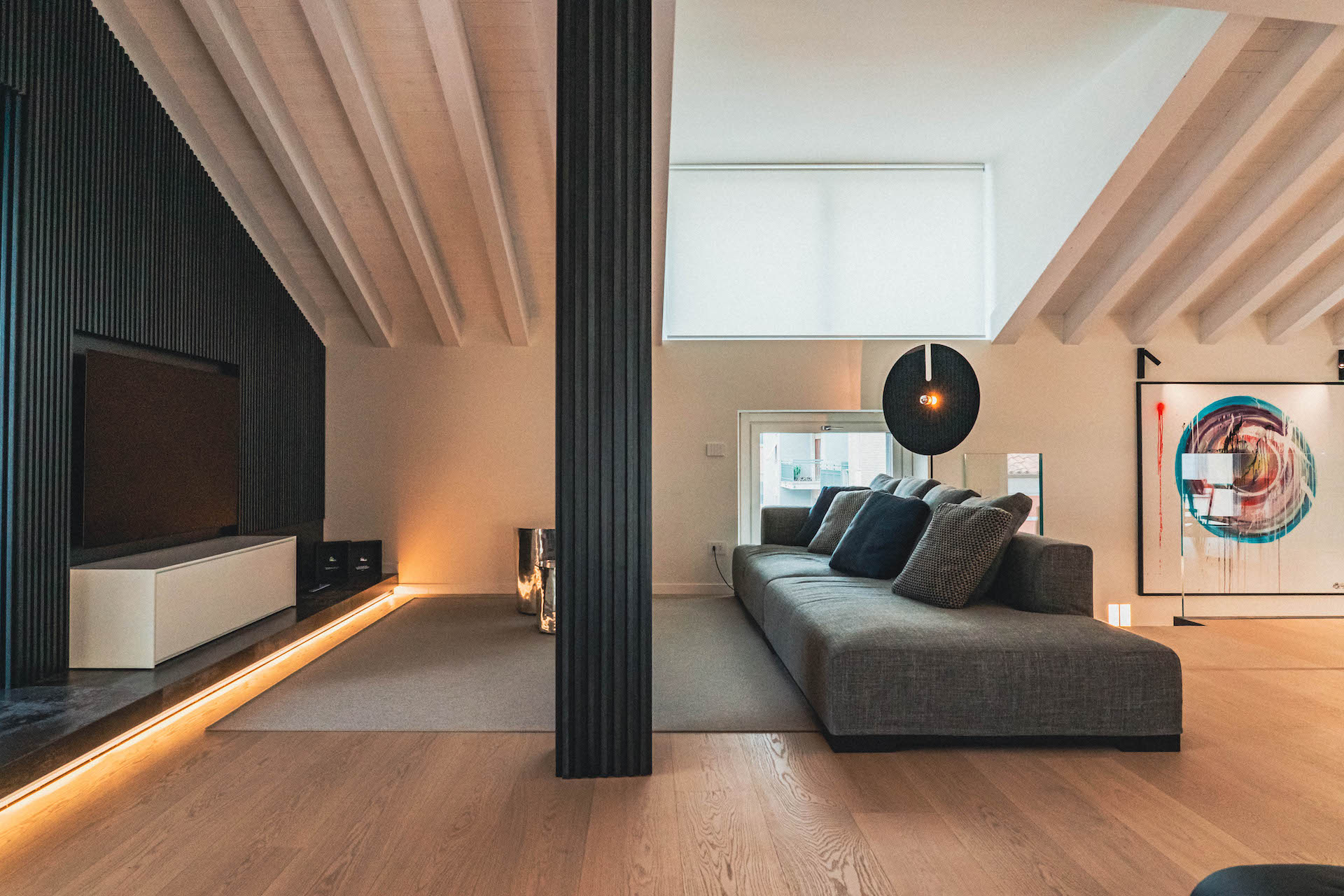 Tutto il piano giorno si sviluppa su due differenti quote di calpestio, evidenziate dal cambio materico della pavimentazione, ceramico per la pedana e ligneo per il resto dello spazio open space.