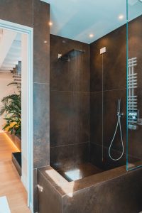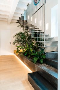 Percorsa la scala ci si ritrova in un lungo corridoio su cui si affacciano le stanze della zona notte, ovvero una camera padronale con bagno en suite e cabina armadio, una cameretta, uno studio e un bagno a servizio del piano. «Abbiamo voluto trasformare il sottoscala – spiegano i progettisti – in una splendida occasione per valorizzare e arricchire un mero spazio funzionale, realizzando un nuovo volume, sempre rivestito in ceramica e integrato ai gradini del basamento della scala dove trovano posto una vasca verde con piante tropicali e uno spazio chilling delimitato da un morbido cuscinone».