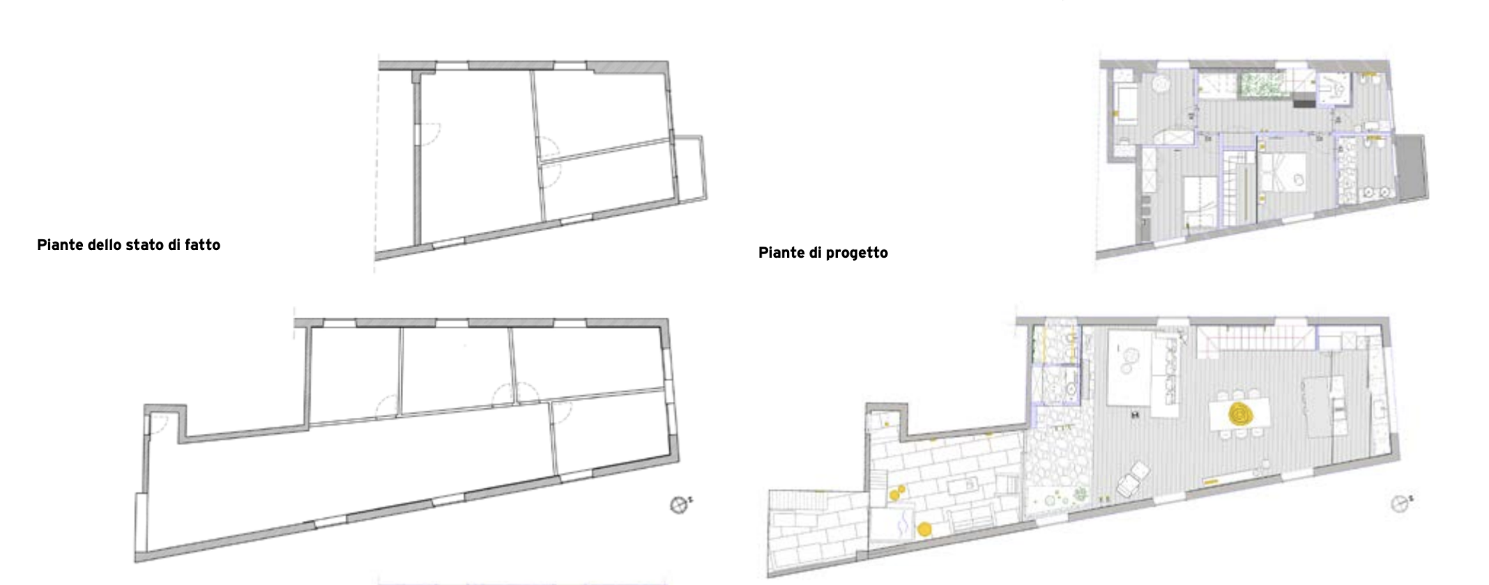 I progettisti hanno liberato quasi interamente il piano attico abbattendo i tramezzi presenti e creando un unico grande open space che ospita il living, la zona pranzo e un’attrezzatissima cucina a vista. Diversamente al piano inferiore sono stati eliminati i soli due tramezzi già esistenti per poter ridistribuire lo spazio e organizzarlo con due camere da letto, due bagni e uno studio.