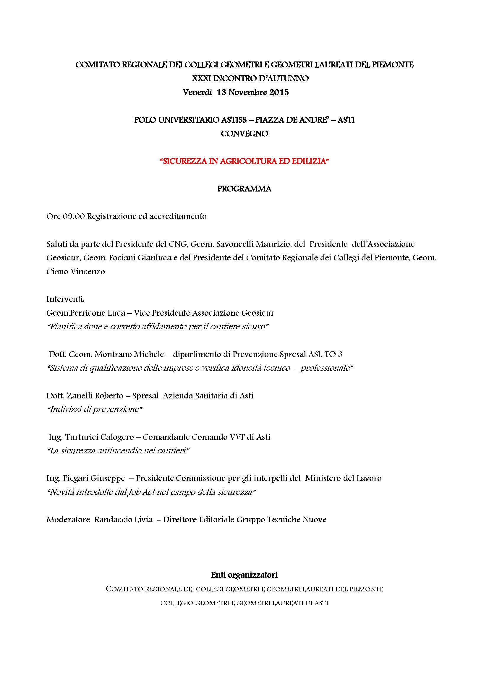 Organizzato dal Comitato Regionale dei Collegi dei Geometri e Geometri Laureati del Piemonte e dal Collegio Geometri di Asti e Geosicur >>, venerdì 13 novembre, ad Asti, presso il Polo Universitario Astiss (piazza De André), nell’ambito dell’iniziativa XXXI Incontro d’Autunno si tiene il convegno “Sicurezza in agricoltura ed edilizia”.